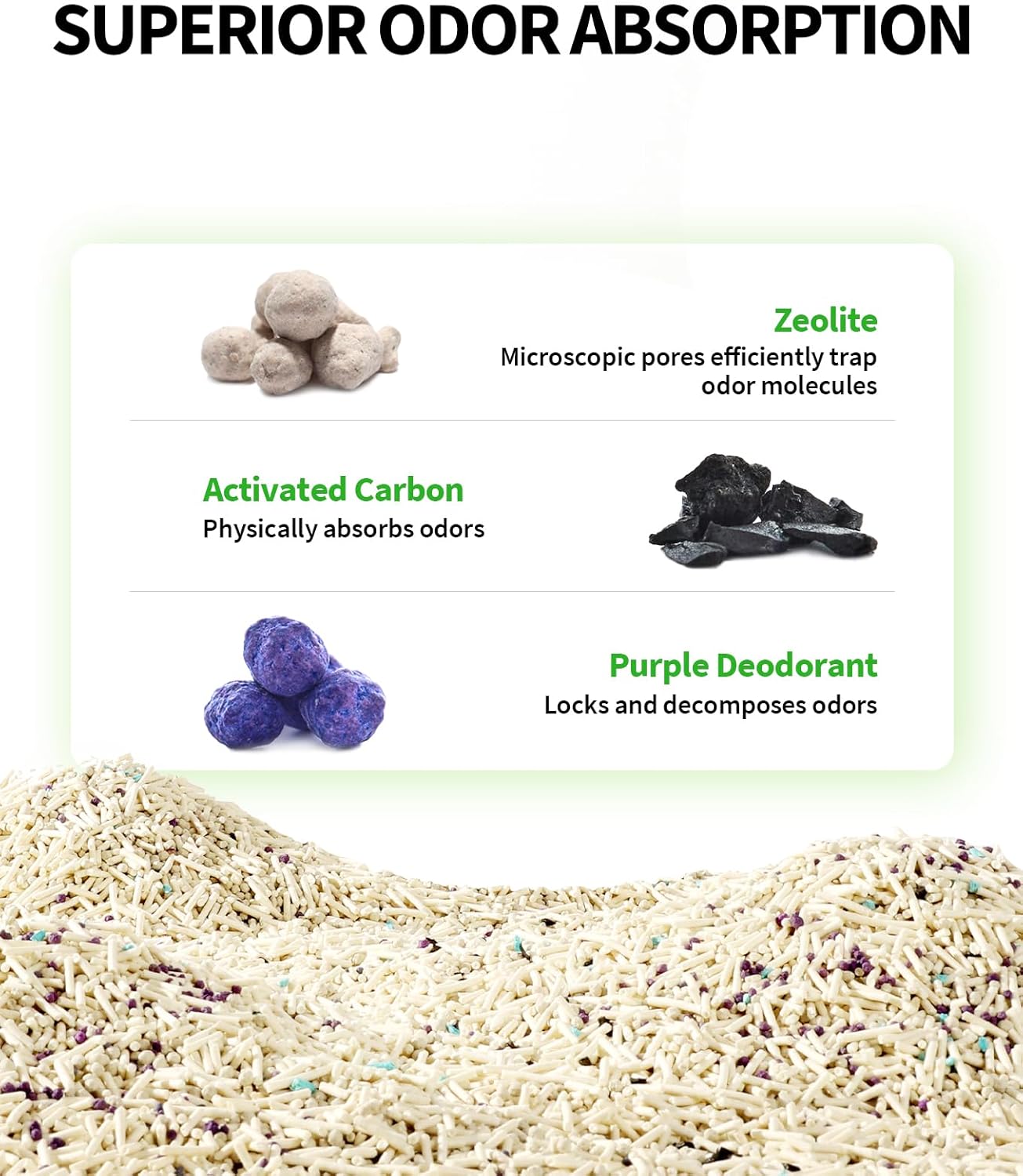 - EFFICIENT ODOR CONTROL: Activated carbon physically absorbs odor molecules, purple deodorant locks and decomposes odors. Zeolite has a unique crystalline structure filled with microscopic pores. These pores highly effectively trap odor molecules such as ammonia and hydrogen sulfide in cat waste, reducing the unpleasant smells in the litter box.