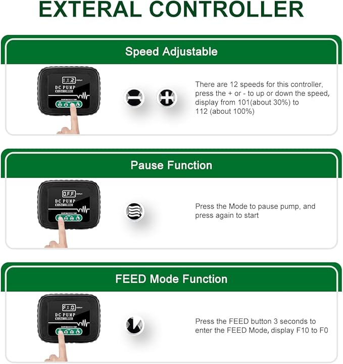 - DC 36V Large Controllable water pump:12 speed adjustable,control the flow from 30% to 100% of max flow,with 10 minutes feeding mode;