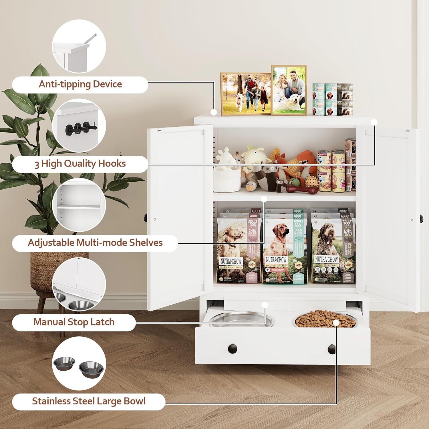 - Adjustable Shelves in Dog Food Storage Cabinet: dog food storage cabinet features adjustable shelves that can be set to any height, allowing users to customize the storage space based on their needs. Unlike other cabinets with only three fixed height options, this flexibility makes it more practical and versatile, accommodating items of different sizes and providing more storage possibilities.