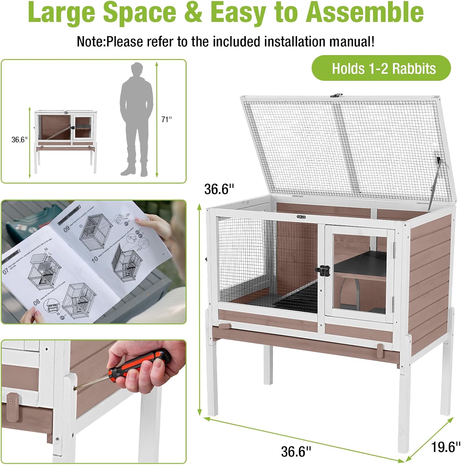 - Spacious Activity Space: Measures 36.6''L x 19.6''W x 36.6''H, providing ample space for 1 rabbit and 1-2 hamsters, guinea pigs, or gerbil.