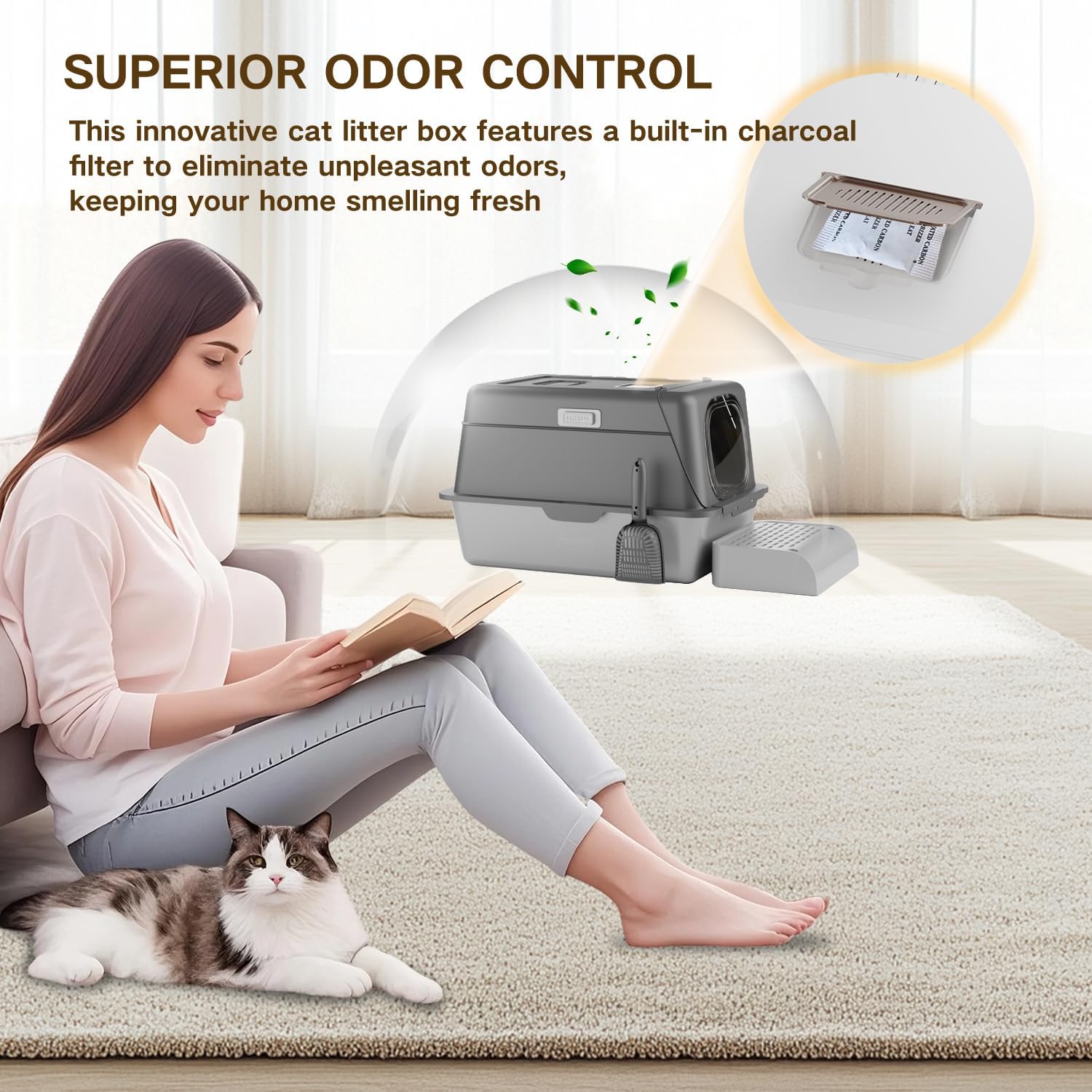 - Dual Mode – Semi-Enclosed or Fully-Enclosed Flexibility Customize your cat’s privacy by using the big cats litter box as either a semi-open or fully enclosed system. The upper lid features ventilation holes to improve airflow and reduce moisture buildup. Comes with a charcoal filter to neutralize odors and purify the surrounding air.