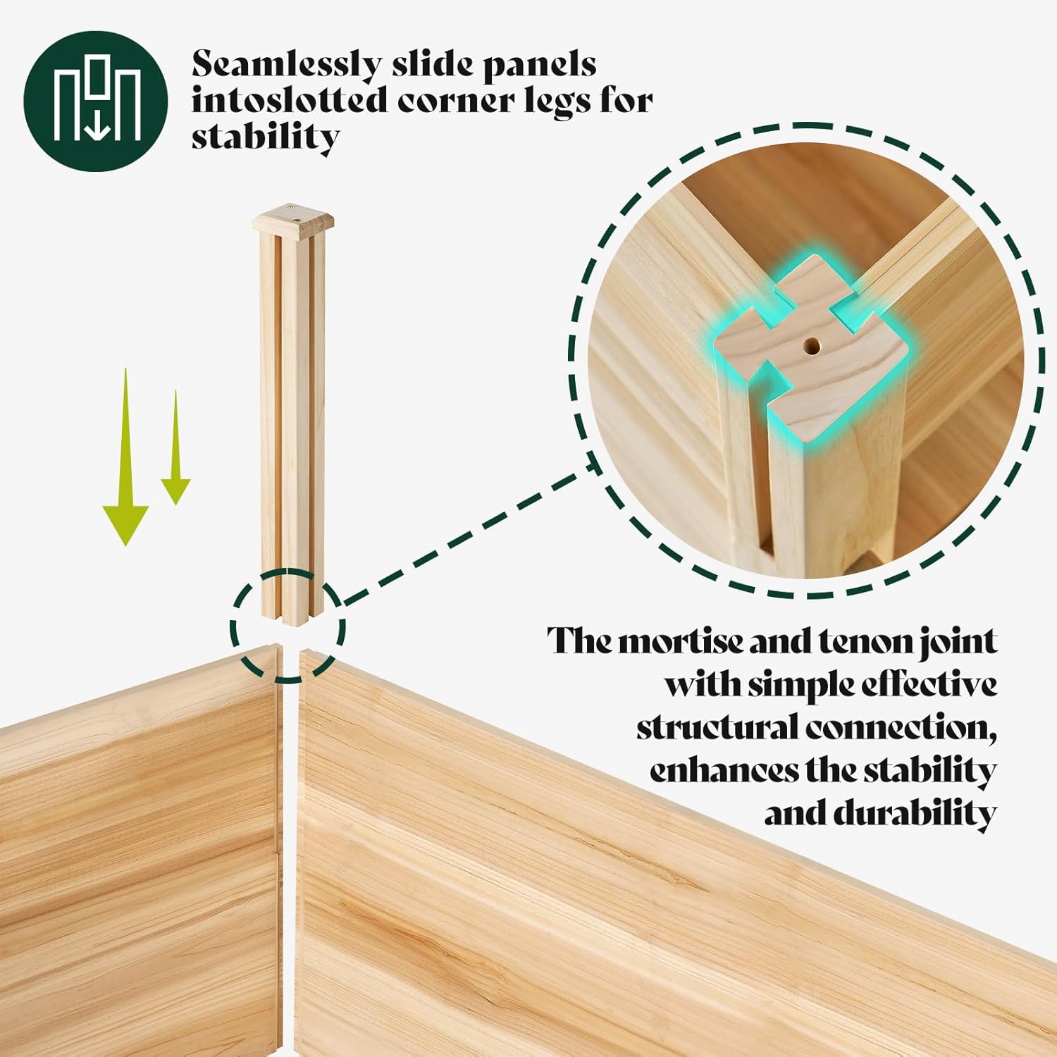- Tool-Free Assembly with Mortise & Tenon Joints: The raised bed features a mortise and tenon design for effortless, tool-free setup, ensuring a stable and secure structure that withstands the elements.