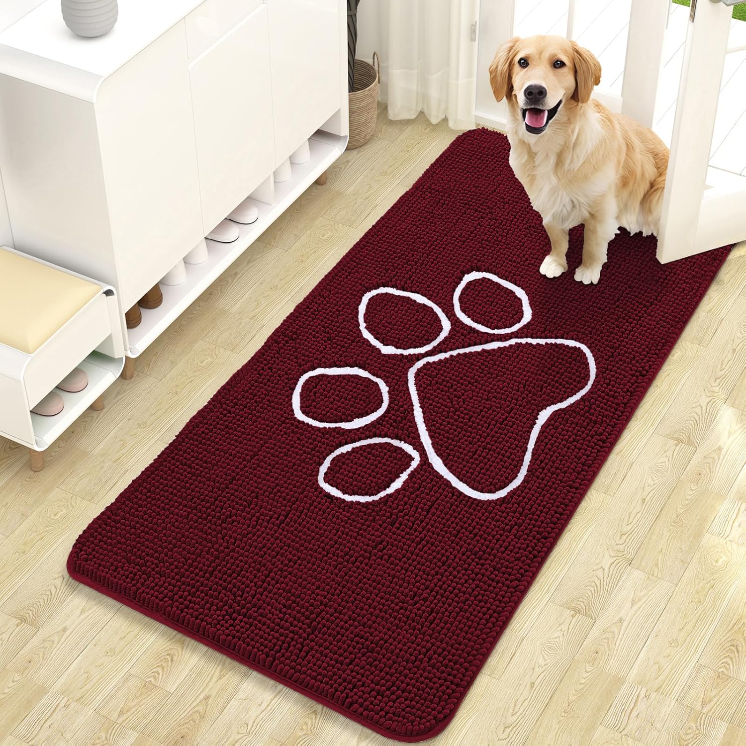 OLANLY Door Mat for Muddy Dog Paws 47x24, Ultra Absorbent Chenille Mud Doormat with Paw Print Design, Non-Slip Washable Doormat for Indoor Entryway, Quick-Dry Pet Bed Mats for Dirty Dogs, Burgundy