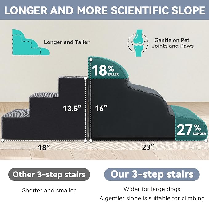 - Specific & Durable Design: Low angle slope design reduces the pressure on joints when pets jump up and down from high bed, sofa, chair and car. Portable handle makes moving stairs easily at home or taking a trip with your pet. The non-slip bottom keeps the stair firmly planted on the ground. No more worrying about your pet slipping and getting hurt! Our foam stair is an essential part of your beloved pet's life! It combines functionality, safety, and durability in one stylish package!