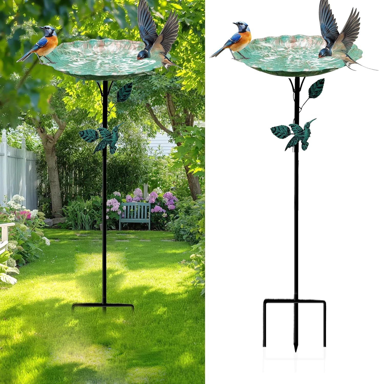 - 【Upgraded 3-Pronged Base for Stability】: Equipped with an upgraded 3-pronged steel base, this bird bath stands firm in the soil, ensuring stability in all weather conditions. The heavy-duty metal stake provides extra support, preventing the bath from tipping or blowing over, making it more reliable than traditional bird baths with fewer support points.