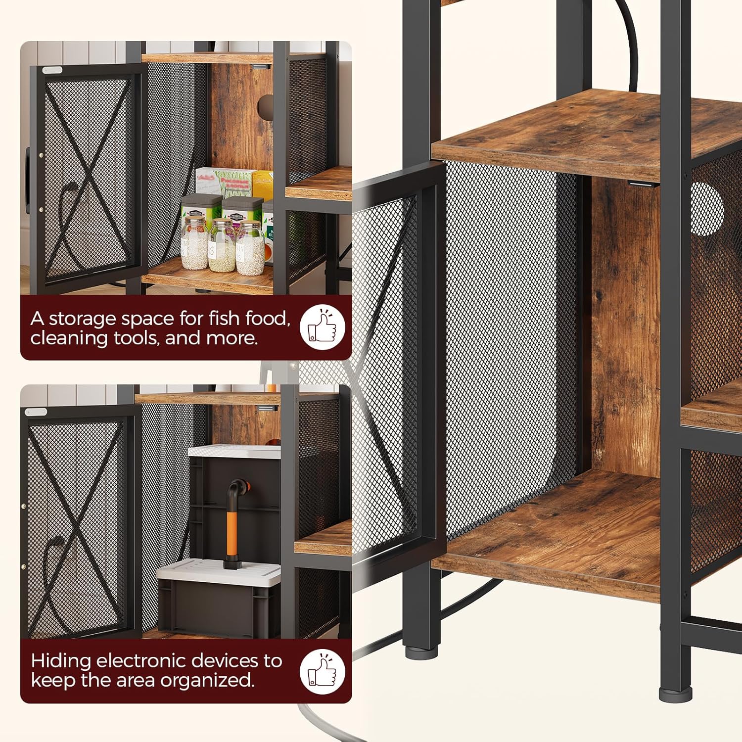 - Easy Power Solution: The fish tank stand, designed for 40-50 gallon tanks, includes 2 AC outlets and 2 USB ports, making it perfect for powering aquarium electronics such as lights and filters. Simplify aquarium maintenance with a handy socket