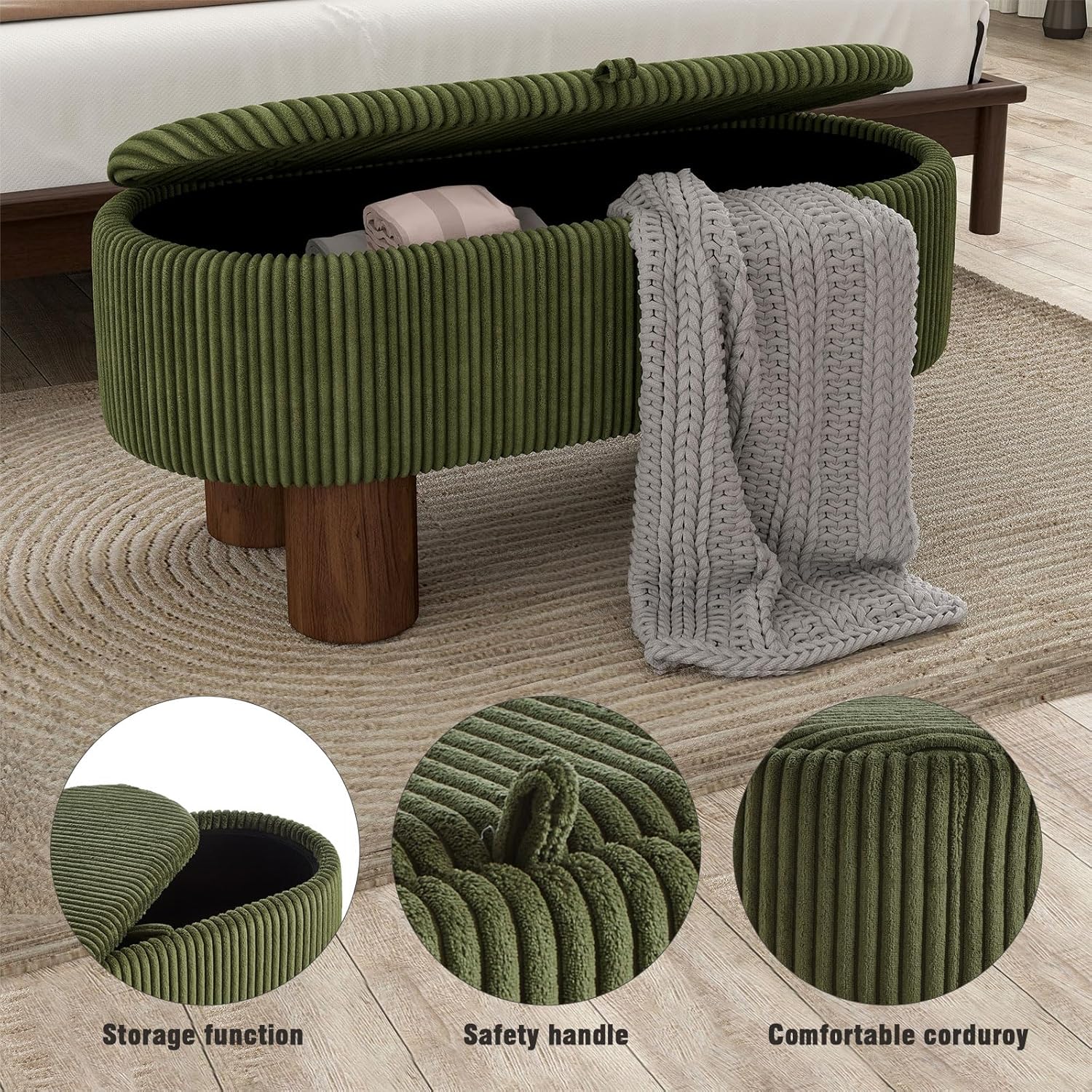 Bench with Storage 43 inch, Upholstered Corduroy Farbic Green Oval Footrest with Hidden Storage, Stool Modern Design Legs for Bedroom, Living Room, and Entryway Furniture Ottoman