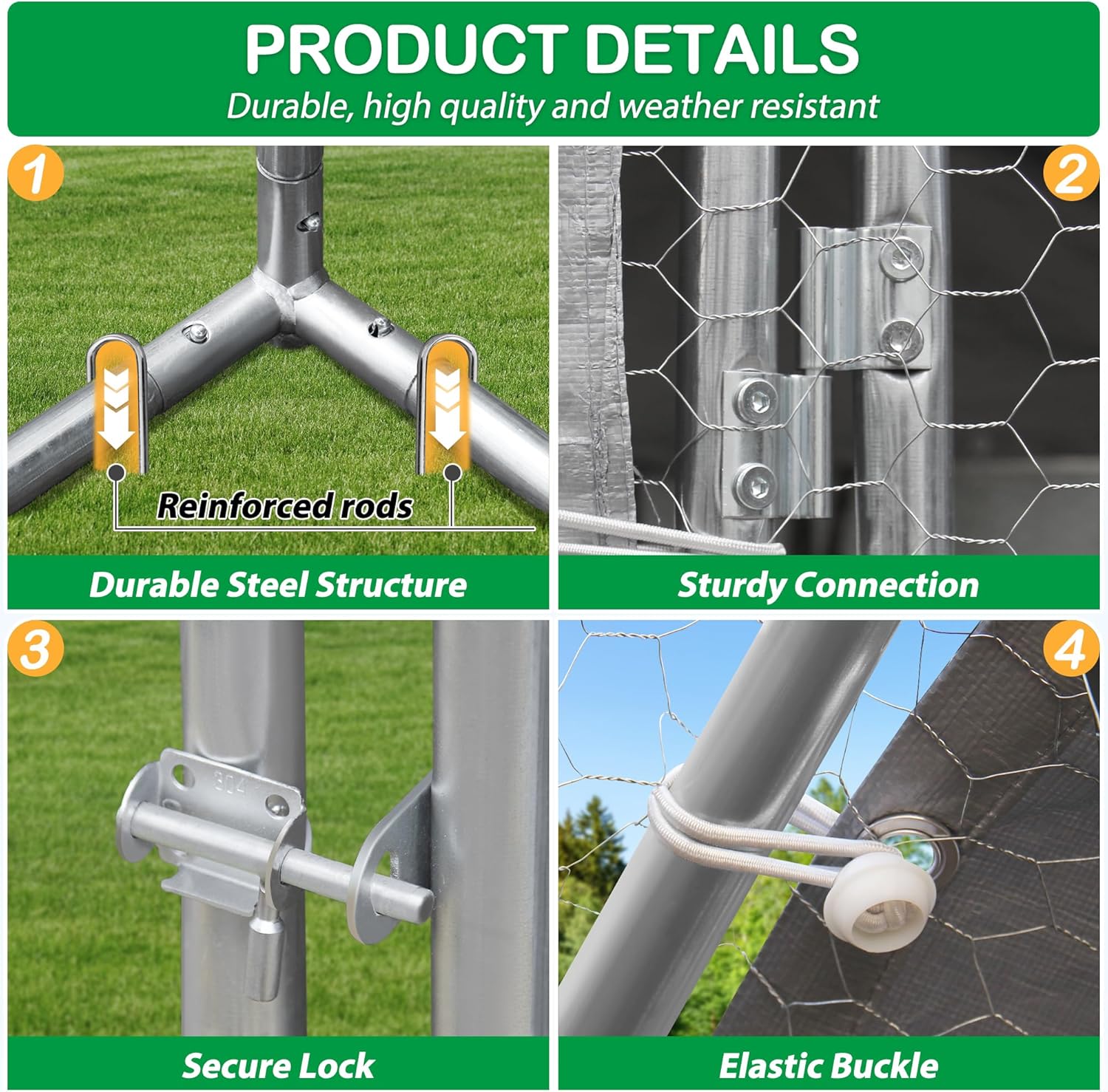 - 🐤WATERPROOF COVER: The metal chicken coop comes with a canopy made of PE fabric, which is waterproof and UV resistant, ensuring your chickens are protected from sun,wind and rain. Secure hexagonal wire mesh ensures your chickens won't escape, creating a safe and comfortable outdoor space for your poultry