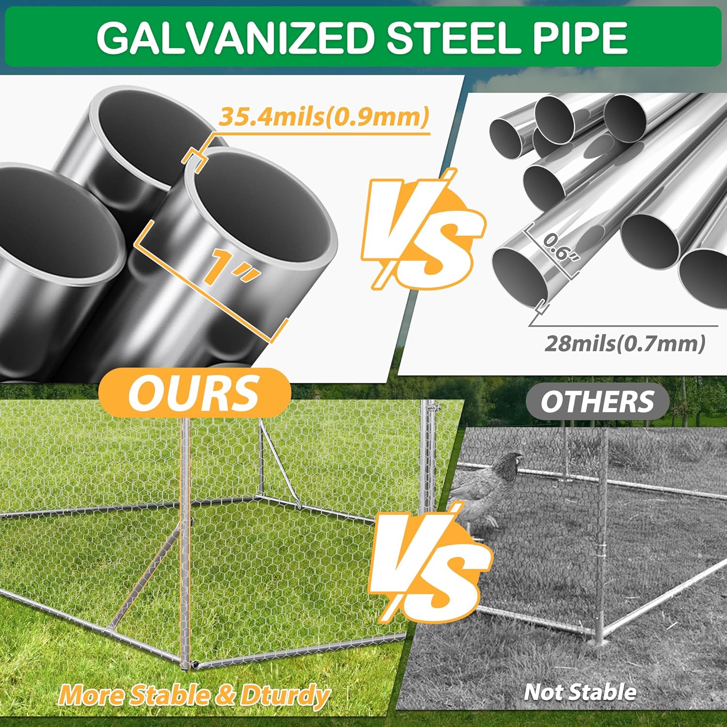 - 🐤STURDY& DURABLE: Our chicken coop is made of upgraded reinforced galvanized steel pipes with a thickness of 0.9 mm, which are strong, more durable and long-lasting than others(0.7 mm thick) .In addition, there are reinforced triangular support bars at the corners to enhance the stability of the coop