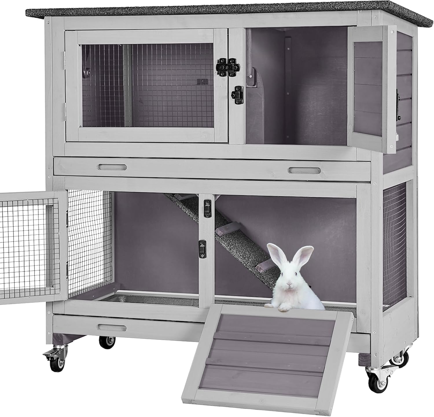 - Rabbit cage with TWO DEEPER pull out trays that won’t leak off and easy-to-clean.