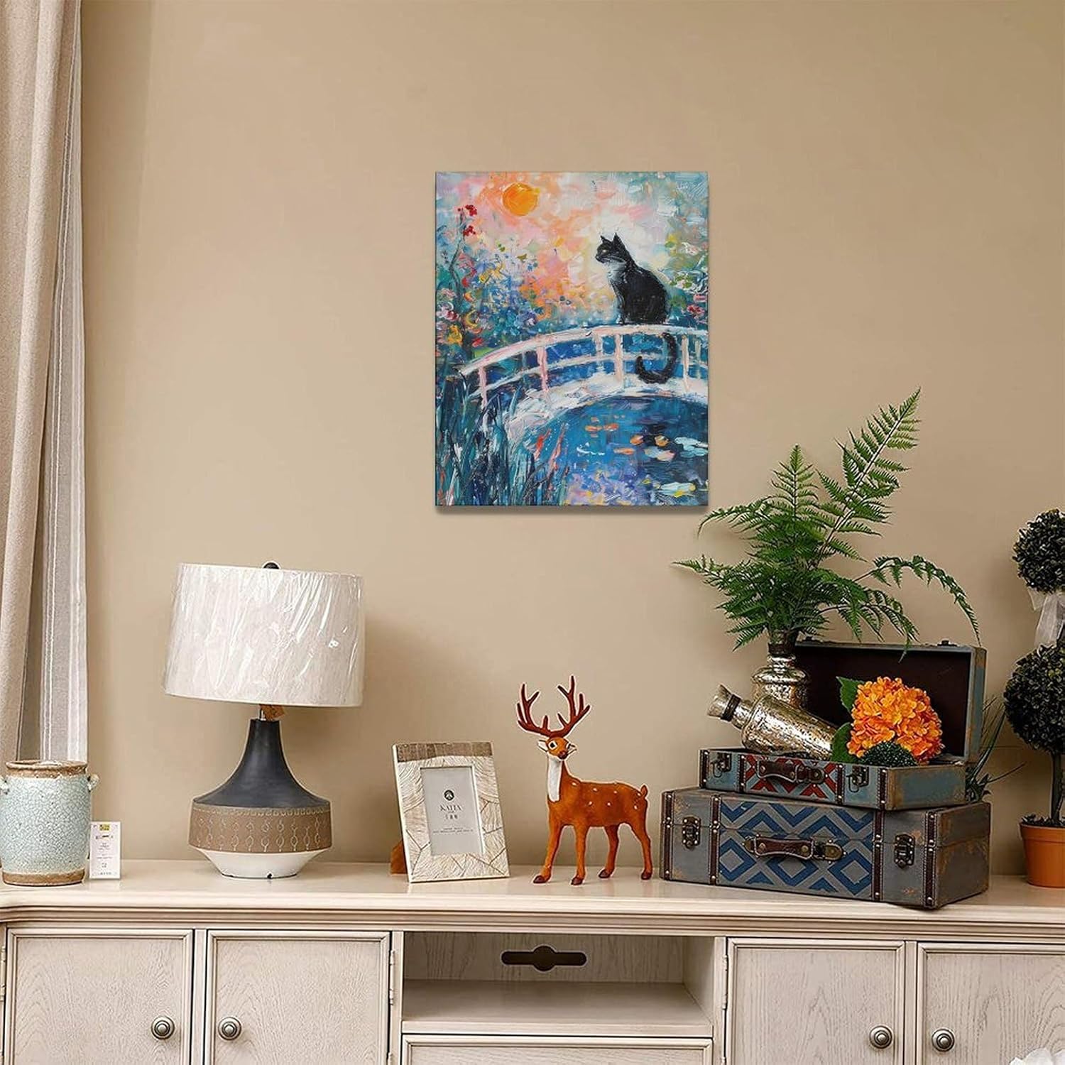 Quorin Black Cat Wall Art Water Lily Sunset Pictures Cat Wall Decor Impressionism Canvas Print Painting Artwork for Bathroom Living Room Bedroom 16"x20"