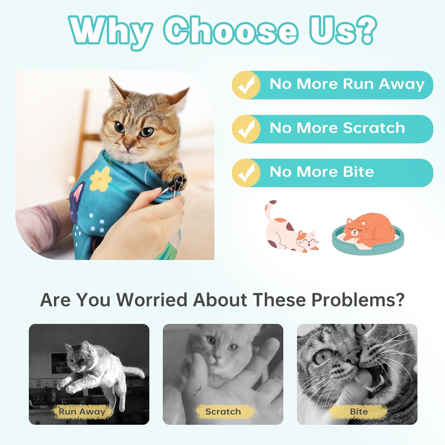 - Cat Grooming Wrap: Our Cat Grooming Wrap is designed to make grooming sessions a breeze. Whether you need to trim nails, clean ears or administer medication, this wrap effective prevents cats from biting, scratching and escaping, ensuring a stress-free experience for both you and your cat