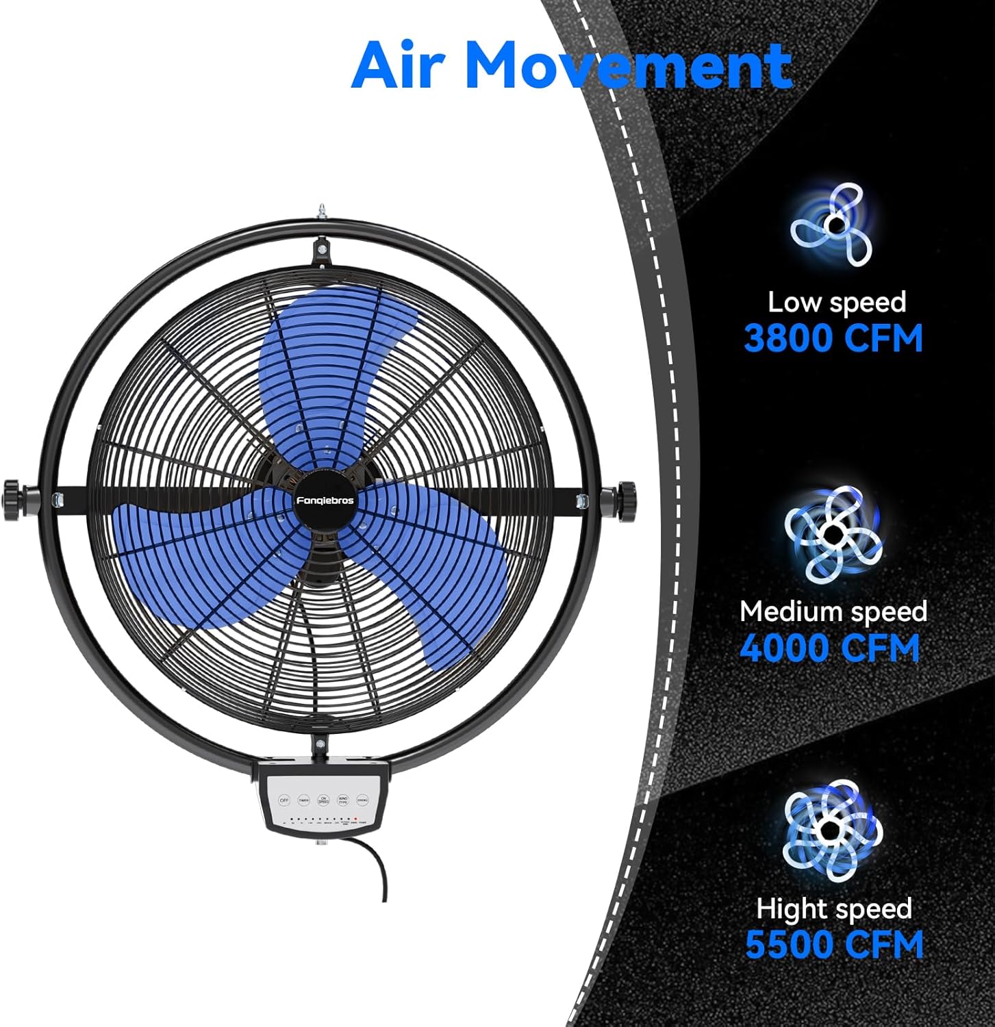 20 IN 5500 CFM Remote Control Wall Mount Fan, 3 Speed High Velocity Wall Fan with Timer, Oscillation & Tilting, Air Circulator for Garage, Commercial, Greenhouse, Warehouse & Gazebo Use, UL Listed
