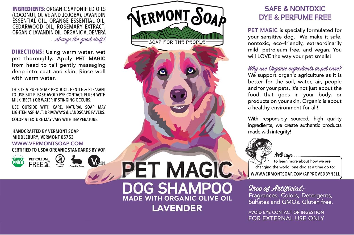 VERMONT SOAP Organics Pet Shampoo - Infused with Organic & Natural Olive Oil, Coconut & Aloe Vera Dog Shampoo for Sensitive Skin - USDA Certified Grooming Pet Shampoo - Lavender (640oz)