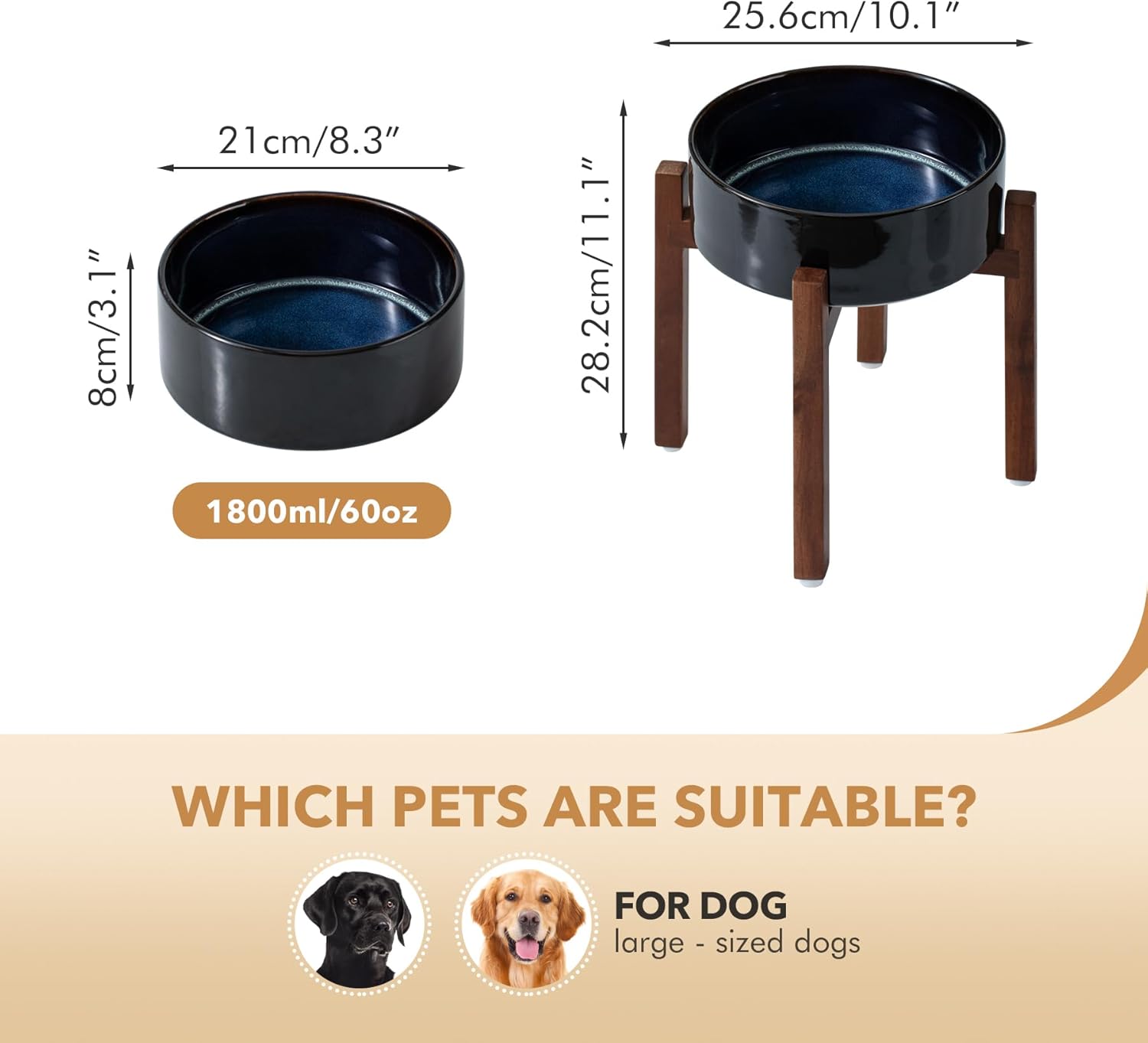 - Acacia Wood Stand: Adopting with classy acacia wood stand, this aesthetically pleasing ceramic dog bowls with stand fits perfectly with any home decor style. By flipping the stand over , you can get 2 different heights to hold the pet bowl. Let‘s elevated bowl company with your pet in different growth stages.