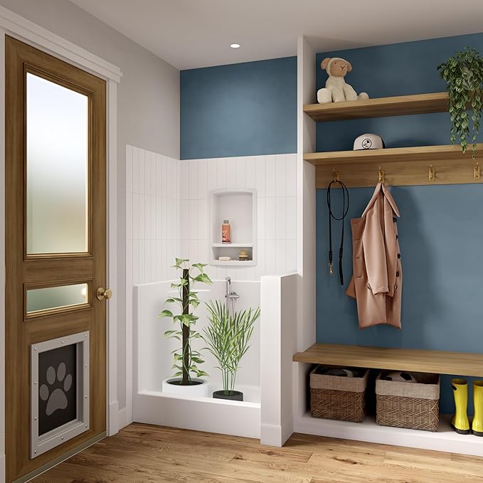 Laurel Mountain Odie 36" x 27" x 36" AcrylX Alcove Center Drain One-Piece Pet Shower in White with Hand-Held Sprayer in Matte Black