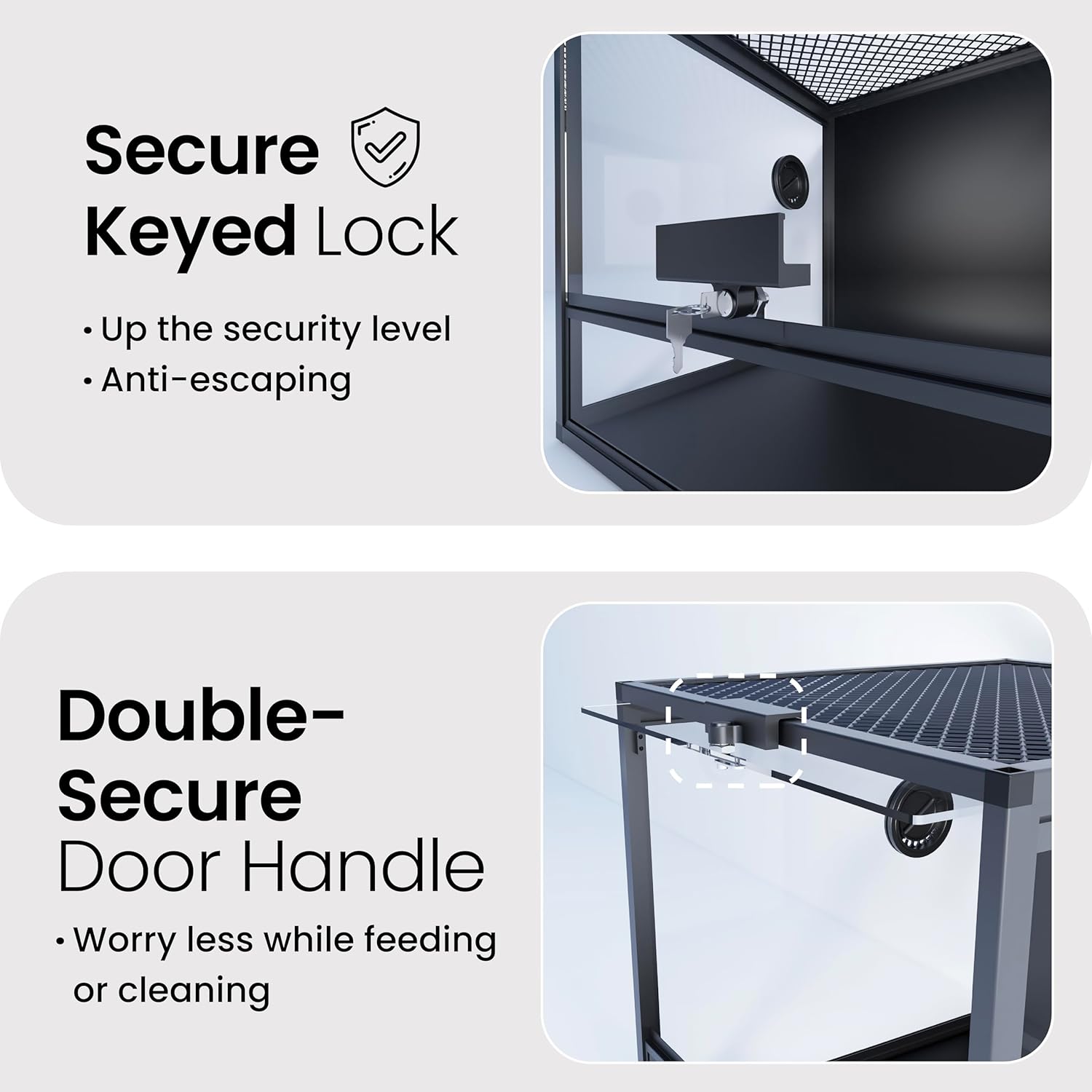 - 【Lock Included】A tempered glass door with a safety keyed lock to prevent escape and accidental opening by others. NO GAPS FOR ESCAPING with fully closed structure. Rigid tempered glass doors for extra safety.
