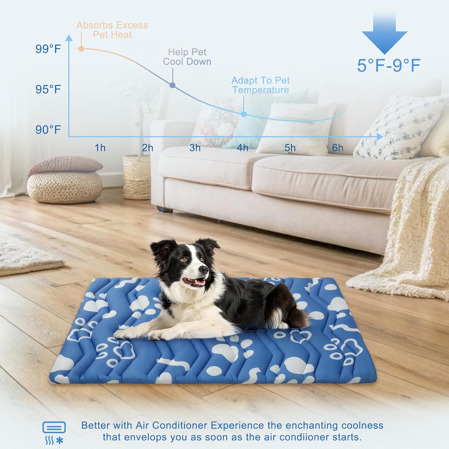 BEAUTYZOO Dog Cooling Mat- Upgraded Thicken Cooling Mat for Large Dogs Reversible(Cool & Warm) Pet Ice Cool Bed Washable & Portable, Summer Crate Pad for Big Dog Puppy Up to 44 lbs, Paw Blue 36X23IN