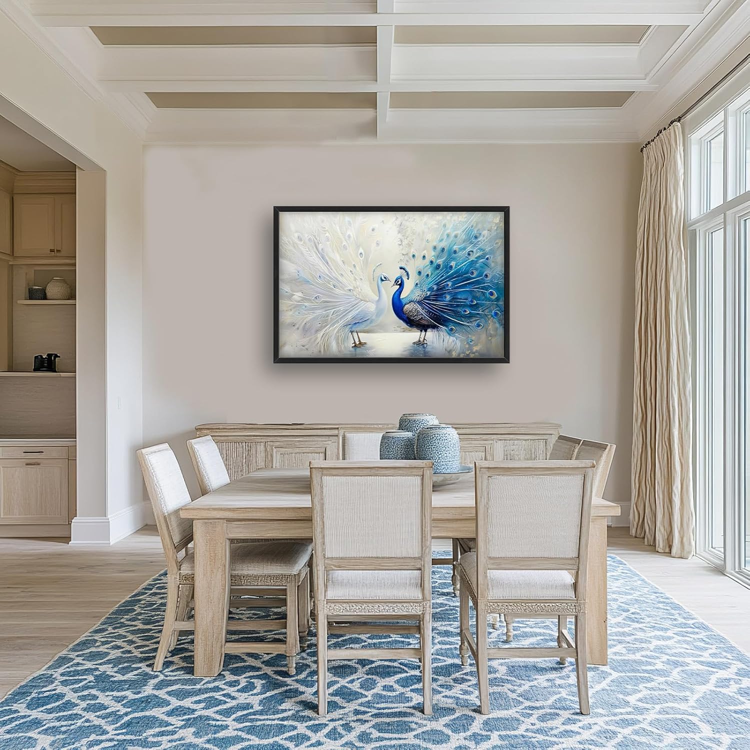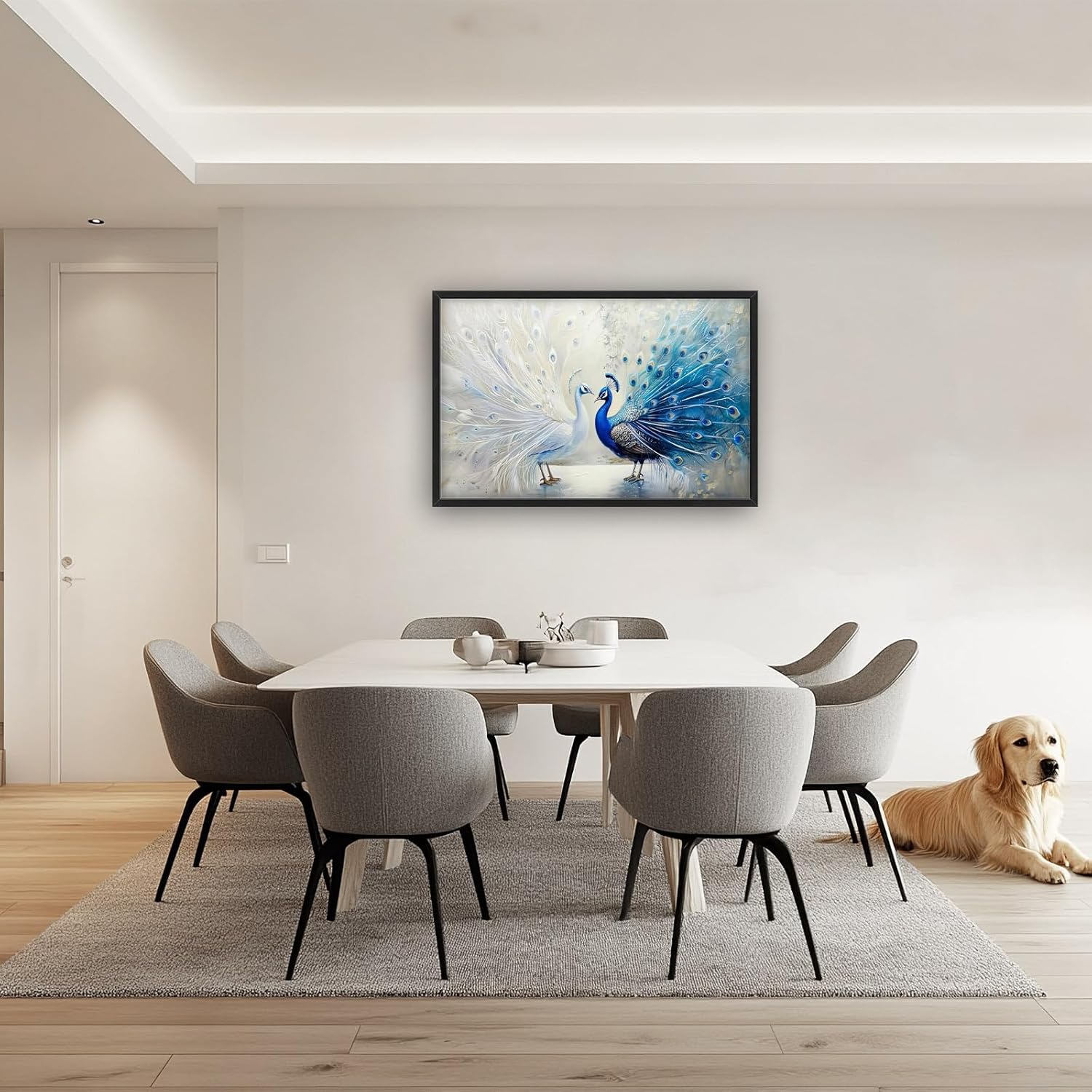 - 【Unique Design】Blue and white peacock painting, oil on canvas, two beautiful peacocks with long tails, white feathers spread out in the background, exquisite feather details, elegant posture, gorgeous colors, symmetrical composition, soft lighting, and romantic atmosphere. The background is blurred to highlight the theme of the peafowl.