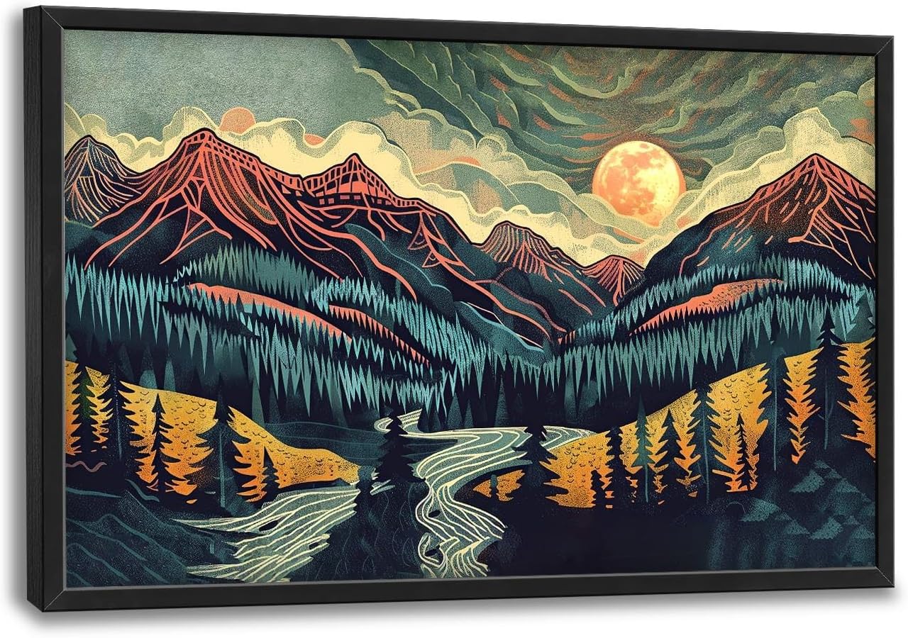 - 【Unique Design】A vintage-style illustrations of the Rocky Mountains, with pine trees and rivers flowing through them in the colors of the full moon. Mountains should be rendered in rugged detail against an atmospheric sky full of clouds. A river snakes between two rows of evergreen trees, adding depth to the scene. The emphasis in this work is on bold lines and flat face blocks. It has retro futuristic elements that give it an otherworldly character.