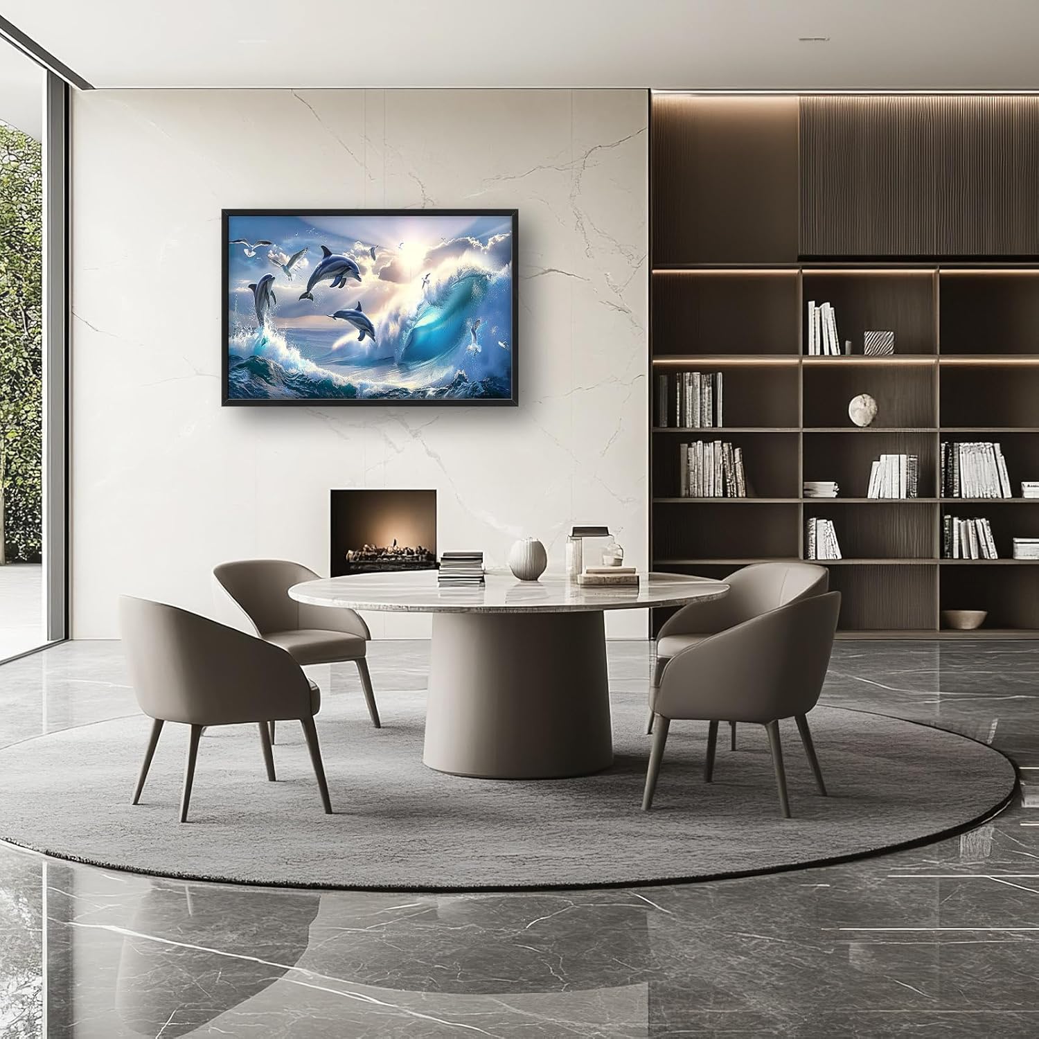 - 【Unique Design】A majestic ocean scene with graceful dolphins leaping out of the water, surrounded by glistening waves and seagulls soaring in the sky, in the style of 3D Realistic.