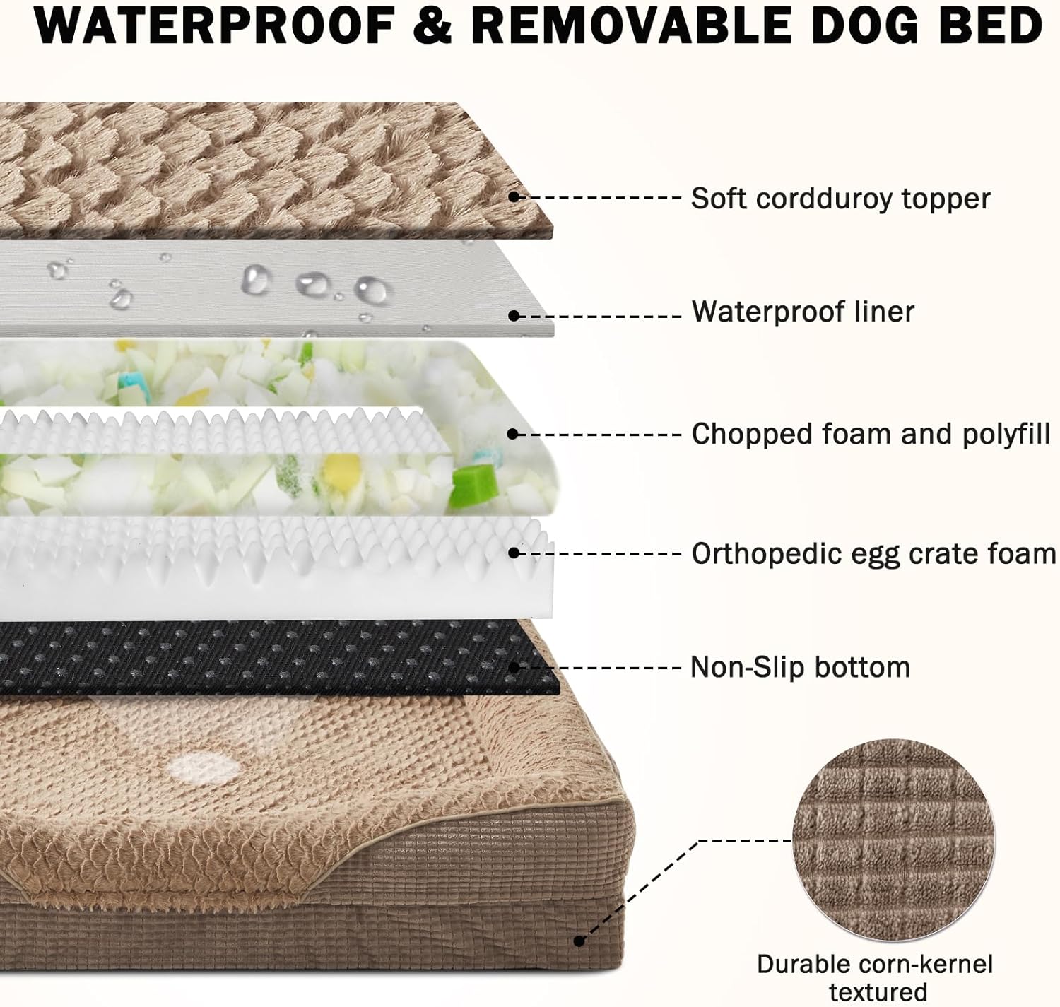 - 🐶WATERPROOF & WASHABLE DOG BED: The dog bed features a fully removable, machine-washable cover with a smooth double zipper for easy to quick remove and care, so just throw it in the washing machine and will be as good as new, ensuring your pet's space stays fresh and hygienic. The waterproof inner lining on the back of the dog bed cover fully protect the egg crate foam from spills, water damage, or accidents, prolonging the product's life.