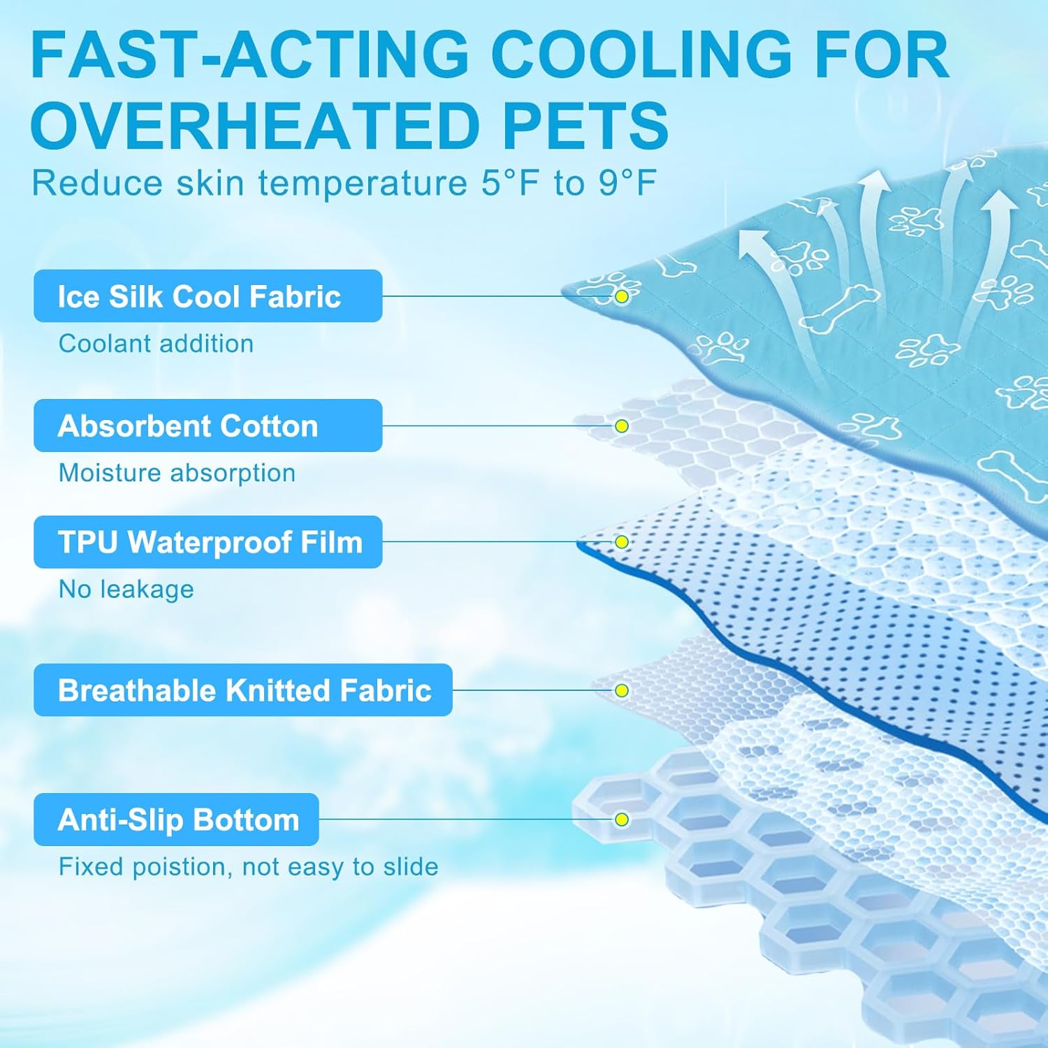 - Dual Effect Cool Comfort-- The cooling mat for dogs and cats is made with Updated Ice Silk Fabric and Coolants, which will effectively lower the temperature. Non-irritating fibers and without refrigeration, water, or electricity can work. Cool but not cold, keeps all your animals, adults and kids healthy and comfortable even in the hottest, most humid conditions.