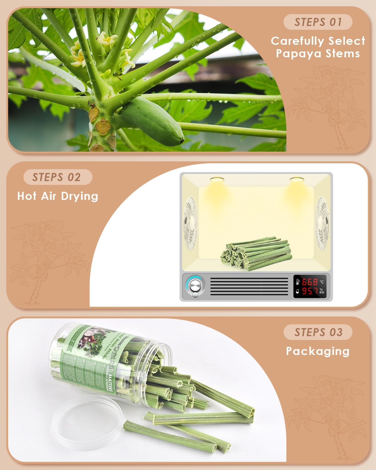 - Natural Organic Materials: 100% natural papaya stem, rich in dietary fiber, xylose, vitamin A&C, low in calories, help digestion, no additives, harmless to your pet. Please be careful not to overfeed your pets, preferably 1 or 2 a day, or every 2 to 3 days