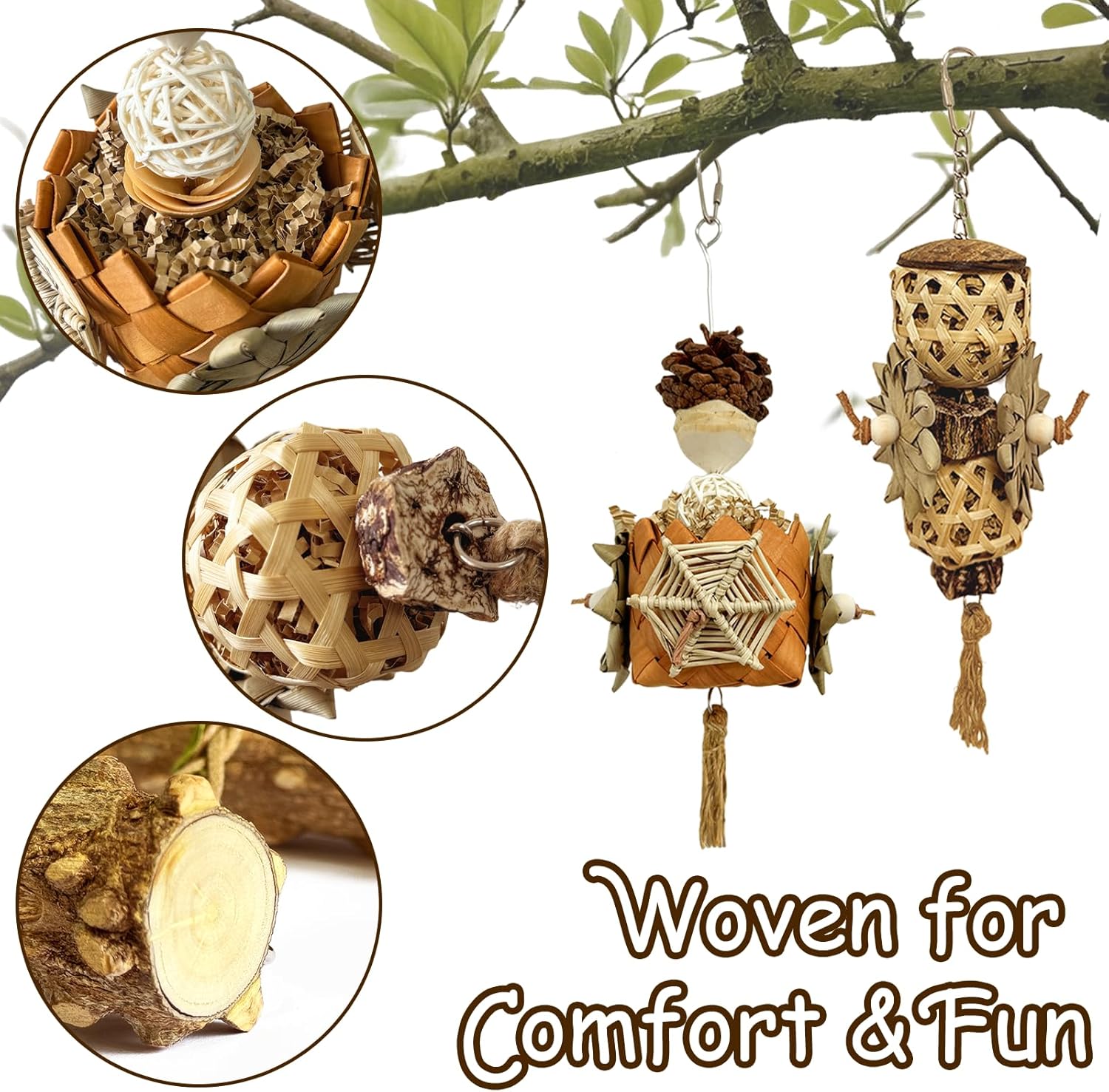 - Natural and Safe Materials: Crafted from non-toxic, natural materials like bamboo weaving, flower pepper wood, rattan balls, corn husks, and wood beads, providing a safe and enriching experience for your feathered friends. Perfect for parrot toys, cockatiel toys, and conure toys.