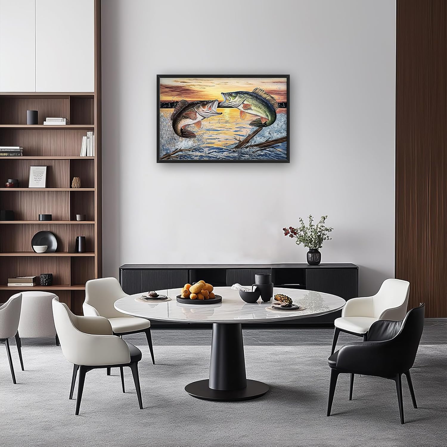 Large Fish Wall Art for Living Room, Framed Bass Fishing Wall Decor, Oversized Rustic Sunset Lake Canvas Painting Fish Pictures Modern Artwork Home Decoration for Living Room Bedroom Office 36"x24"
