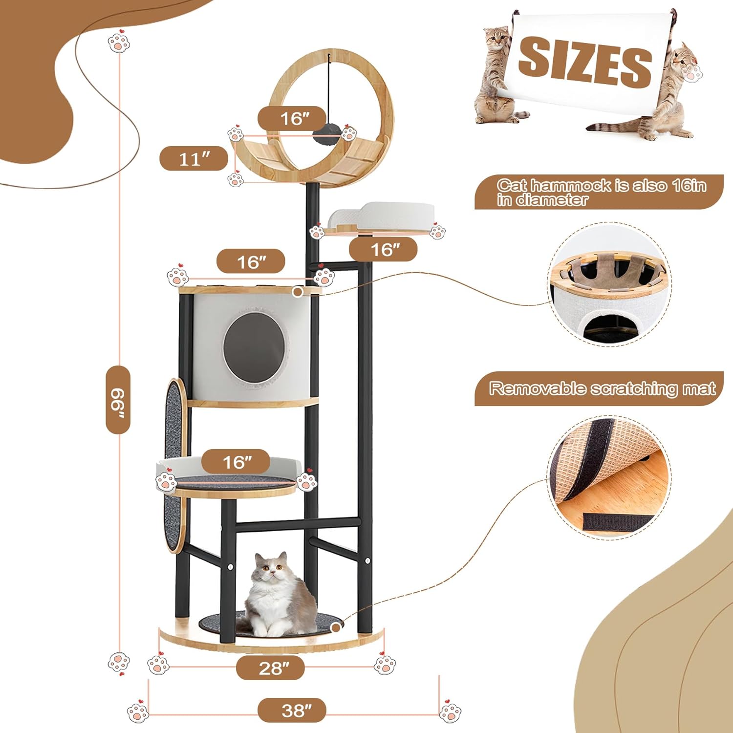 Cat Tree, 66In Cat Tower with Scratching Post, Tall Multi-Level Cat Houses for Indoor Cats Large Adult, Cute Cat Post Cat Condos with Dangling Ball,Plush Platform, Hammock, Big Cats Climbing Tower