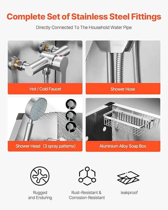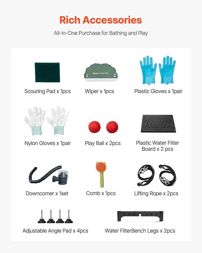 - Complete Accessories: The pet washing sink includes a showerhead, faucet, and a direct connection to a home hose for durability. It also comes with cleaning cloths, a squeegee, play balls, a brush, and gloves, allowing your pet to fully enjoy their bath time