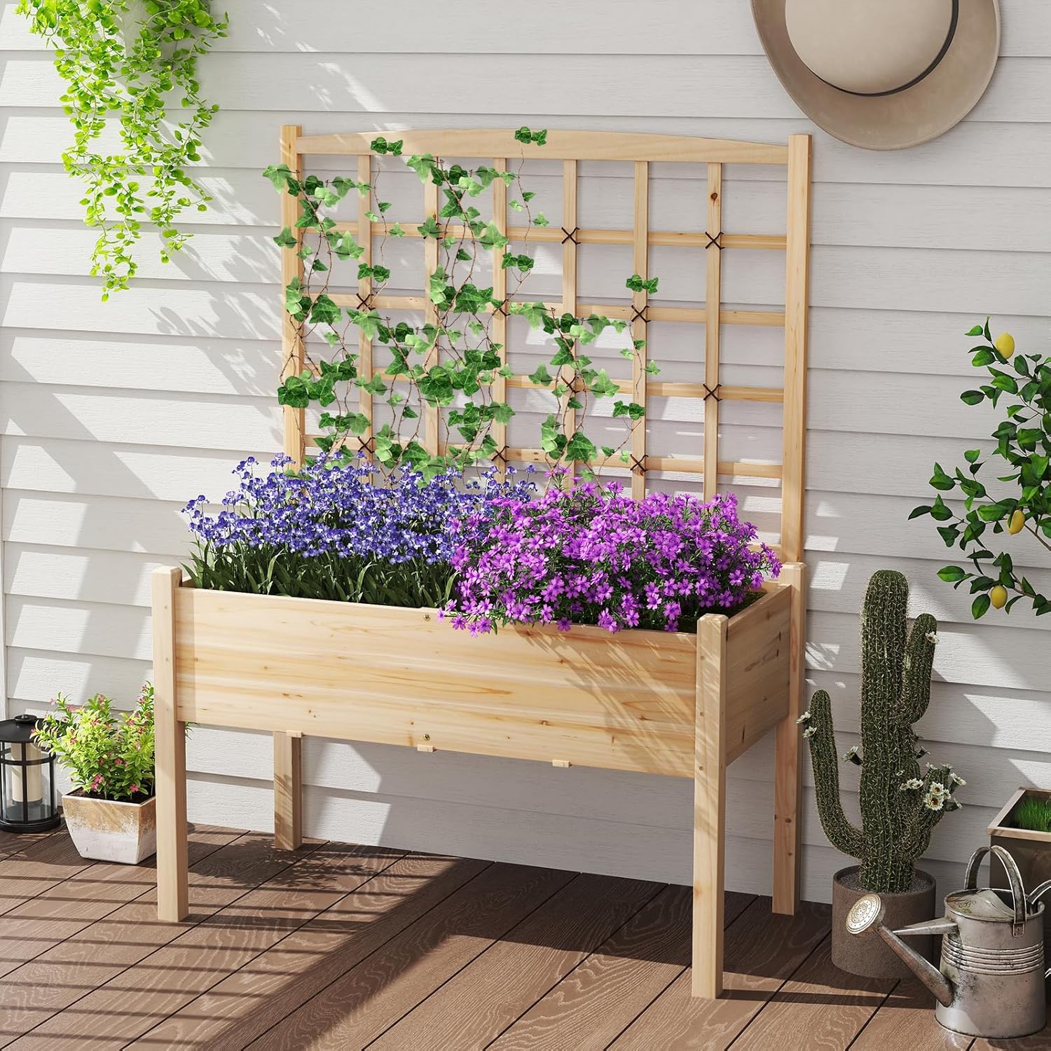 Giantex Raised Garden Bed with Trellis, Wooden Elevated Planter Box with Legs, Drainage Holes for Climbing Plants Vines Vegetables Flowers Herbs, Outdoor Horticulture Planter for Patio Yard (Natural)