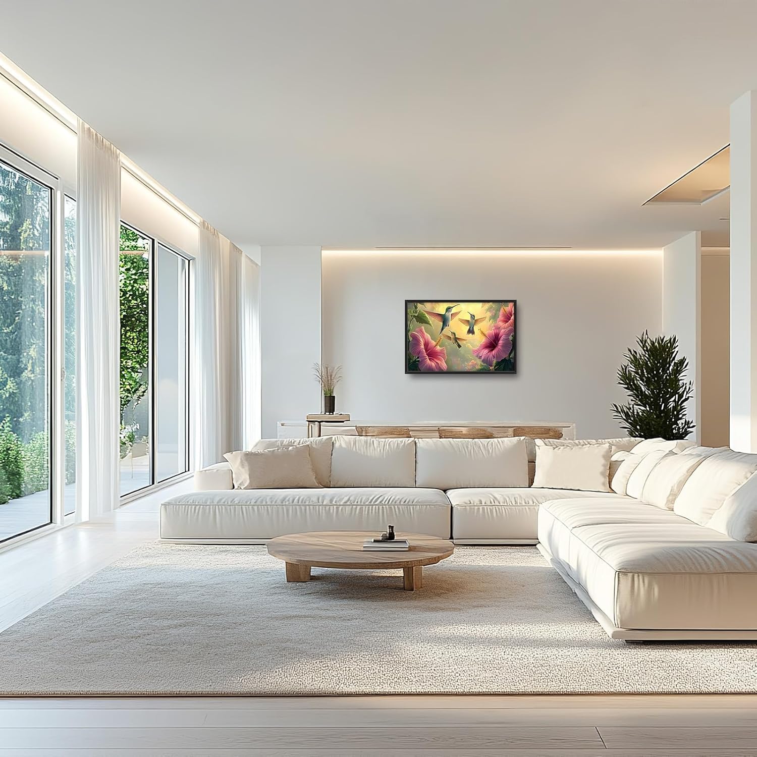 Framed Large Hummingbird Wall Art for Living Room, Oversized Rustic Bird Flower Wall Decor Floral Canvas Painting Nature Sunrise Pictures Modern Artwork for Bedroom Office Dinging Room 36"x24"
