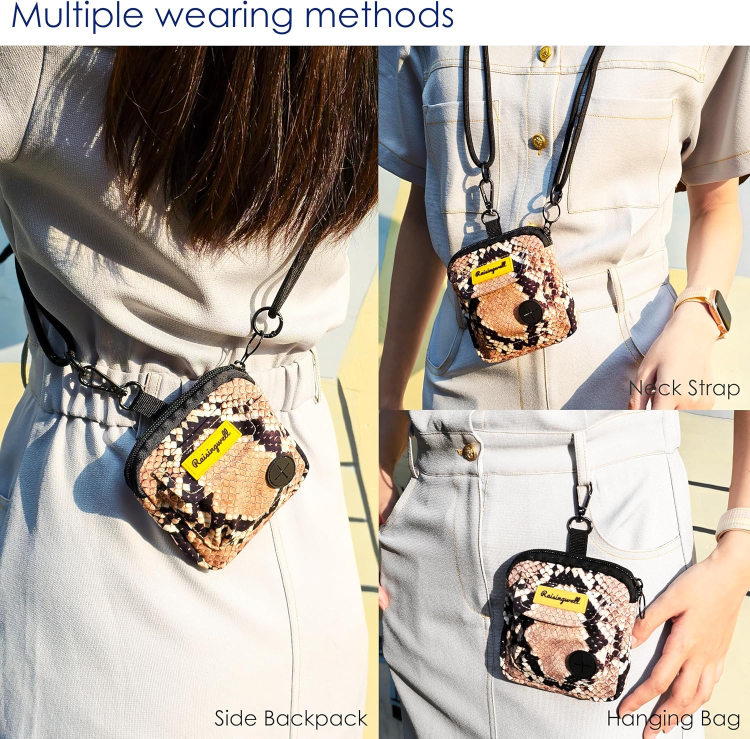 - Raisingwell Dog T1、Fashion Design: This dog training treat bag measures 4.9 x 5.1 inches and offers versatile wearing options. It comes equipped with a carabiner and a strap, allowing you to hang it on your leash, attach it to your pet's collar, or even wear it as a trendy accessory on your bag. The bag features a zipper closure, ensuring that treats stay secure inside even when you're playing with your pet afterward. It's perfect for carrying around or using during short outings.reat Pouch
