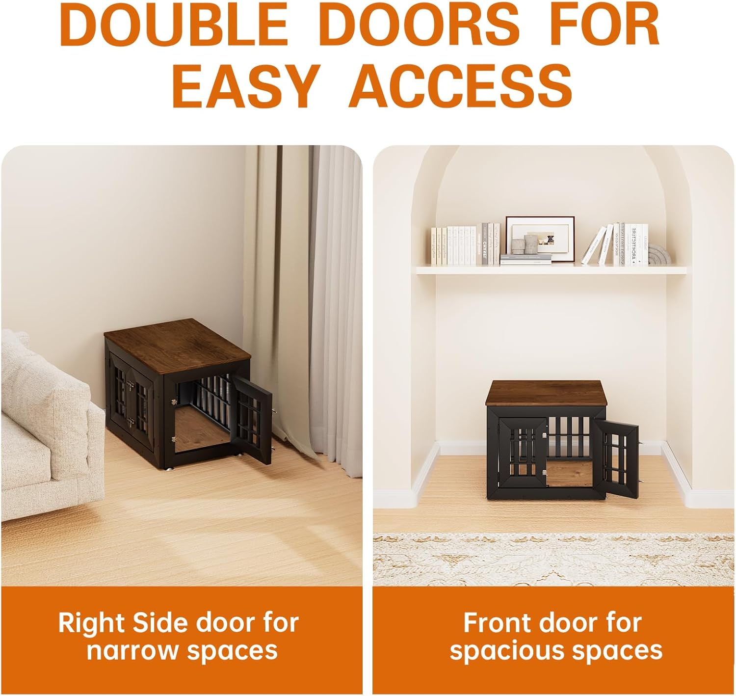 - 【Double Doors Design】The dog kennel furniture has a front door and a side door, your pet will go in and out easily with double doors. The double-doors design can adapt to more different space environments. You can decide whether to open the front door or the side door according to your needs.