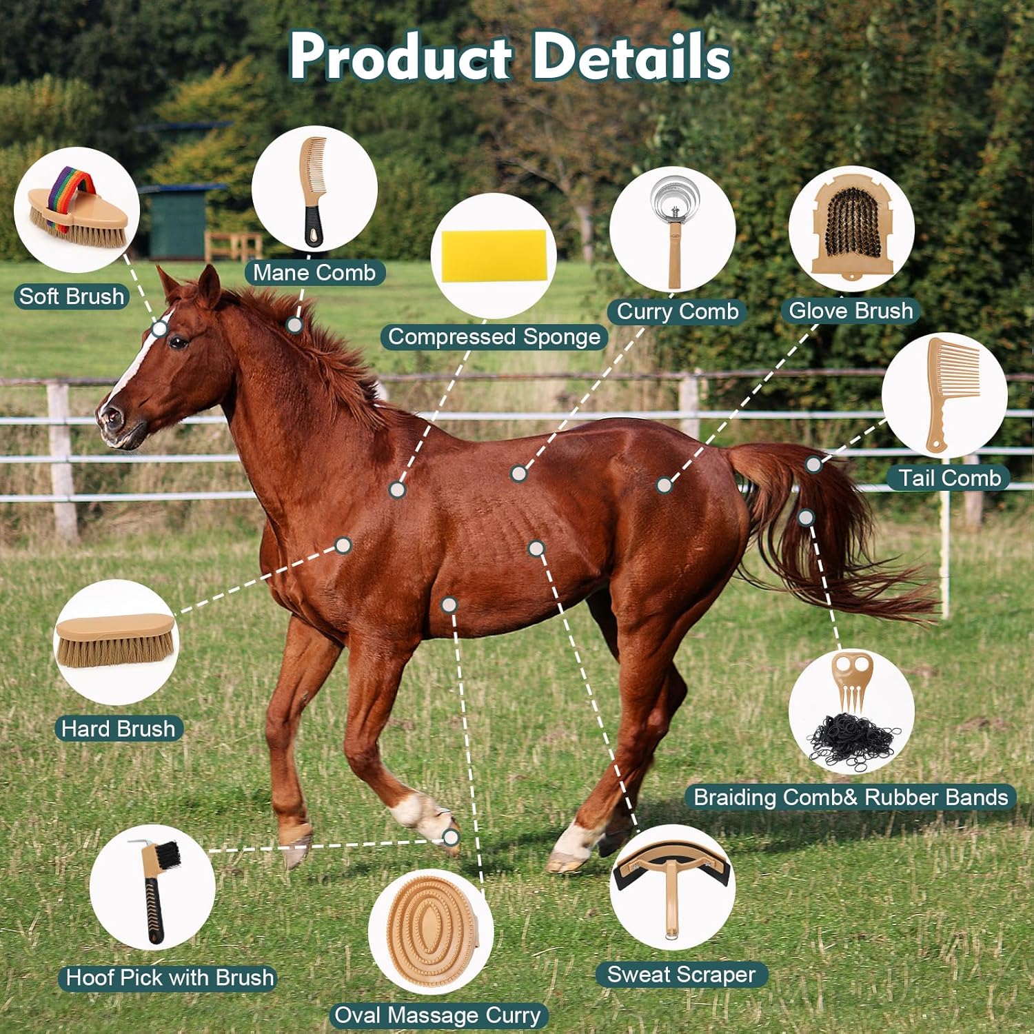 - All-In-One Horse Grooming Accessories Set: GHWMYD horse brush set includes 13 kind of grooming essentials, including Soft Brush, Hard Brush, Rubber Glove Brush, Bathing Sponge, Oval Massage Curry, Mane Comb, Tail Comb, Braiding Comb and Rubber Bands, Curry Comb, Hoof Pick with brush, Sweat Scraper, Reversible Stainless Steel Curry Comb and a Mesh Storage Bag. From mane to hoof, every aspect of your horse's grooming needs is covered