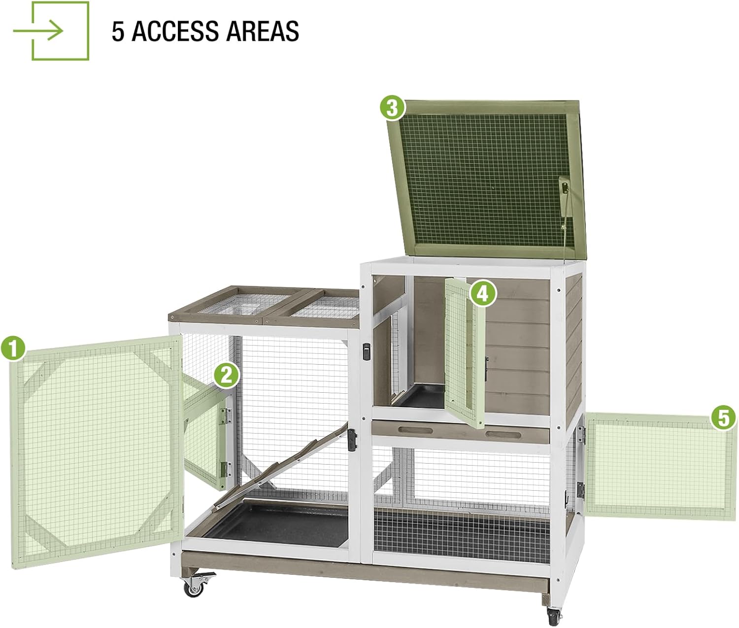 GUTINNEEN Rabbit Hutch Indoor Mobile Bunny Cage with Run Wooden 2 Story Guinea Pig Cage Outdoor for Small Animals with Wheels,Two Deeper No Leak Trays(Grey)