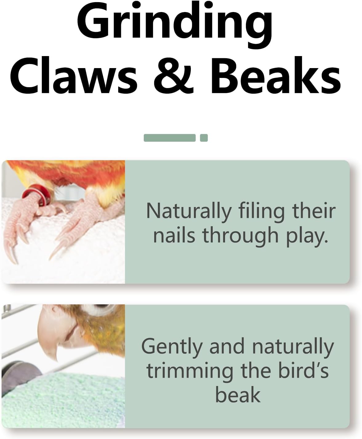 - 🦜 Promotes Beak & Claw Health ---- Designed for beak grinding, claw trimming, and foot massage, this beak grinding perch helps maintain healthy claws and beak shape naturally. Ideal for small birds, parakeets, conures, and cockatiels who love to chew, scratch, and climb.