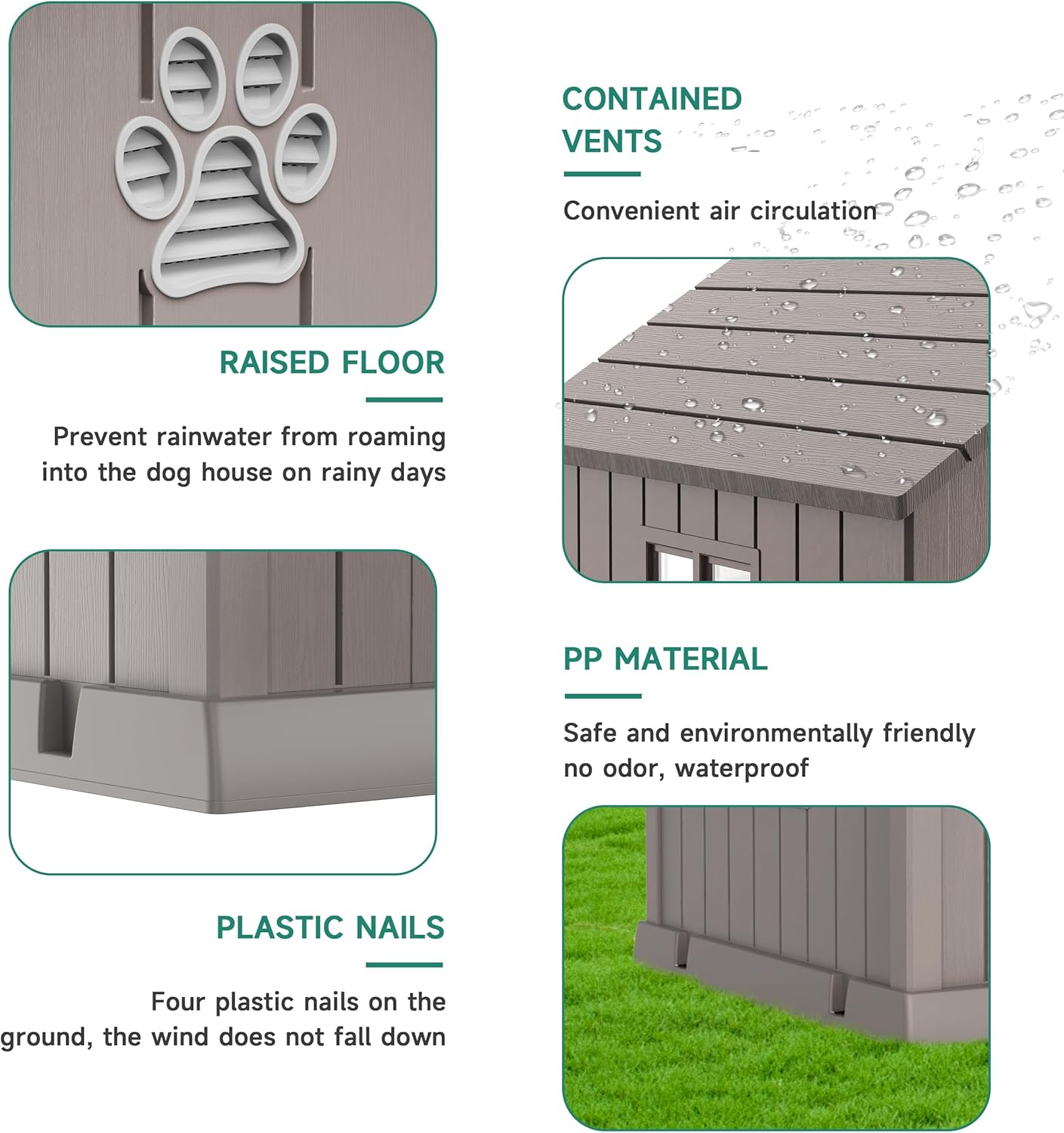 Vixzen 38in Large Outdoor Dog House,Durable Water Resistant Resin Dog House,Doghouse for Small to Large Dogs Indoor or Outside,with Air Vent and Elevated Floor,Gray