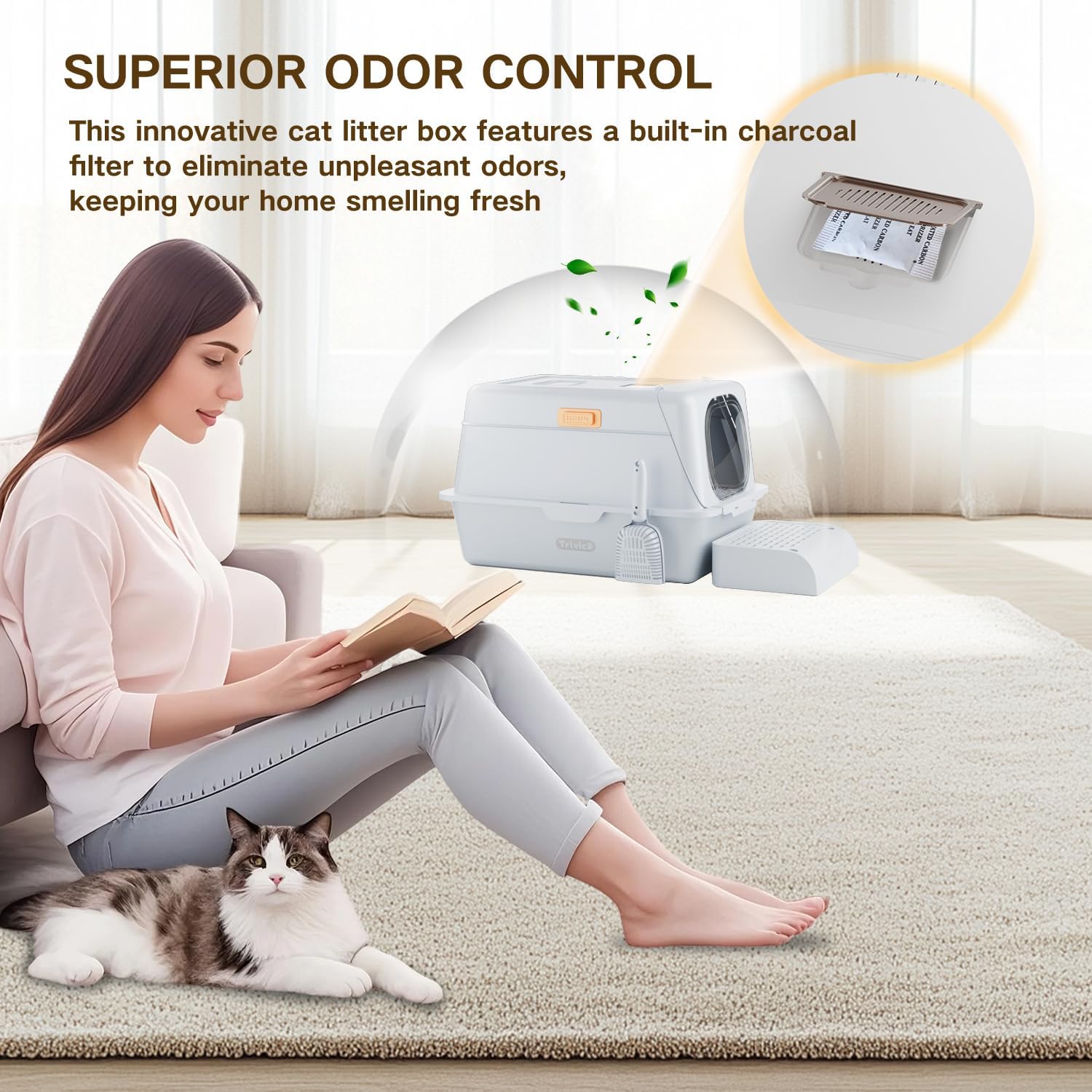 - Magnetic Flap Door – Effortless Entry, Superior Odor Control Equipped with a magnetic front door, this litter box allows your cat to enter and exit freely while locking odors inside. The strong seal helps trap smells and prevents litter tracking, making it ideal for indoor use. Keeps your home fresh and clean with every use.