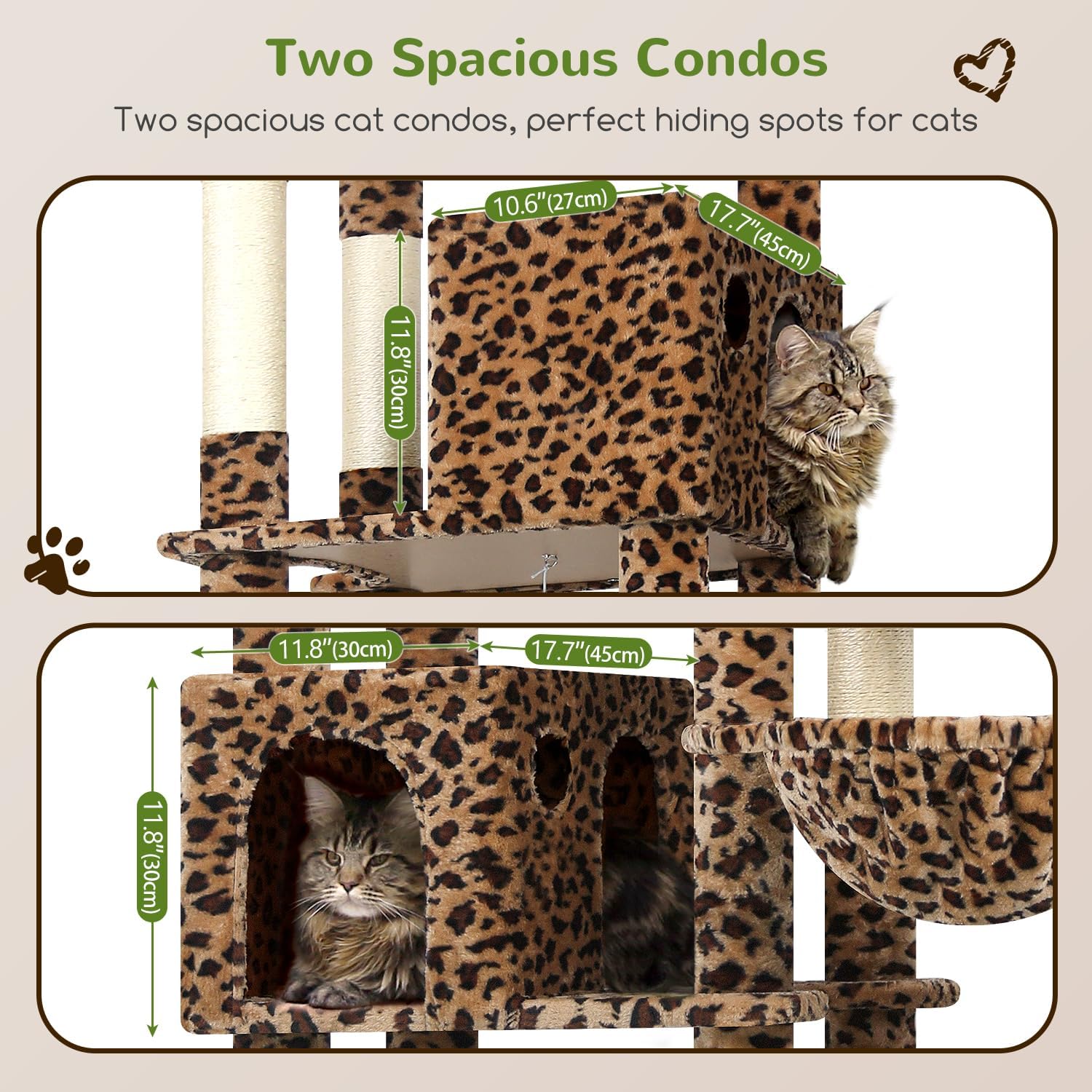 - SPACIOUS CAT CONDOS: This cat tower for indoor cats with two spacious enlarged cat condos provides privacy for big cats, suitable for multiple large felines to rest or play