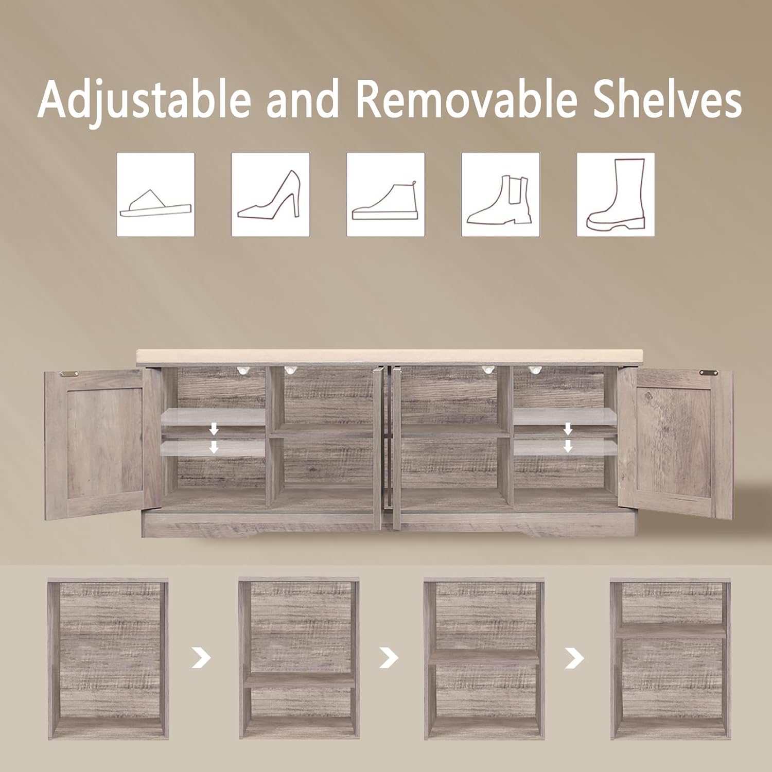 - 【Flexible for Multiple Needs】4 middle compartments are fixed for sneakers, high heels and sandals. The side compartments have 3 adjustable heights for slippers, tall boots or storage boxes. Use as an entryway bench, window seat or bedside bench to store blankets, books and toys in the living room and bedroom