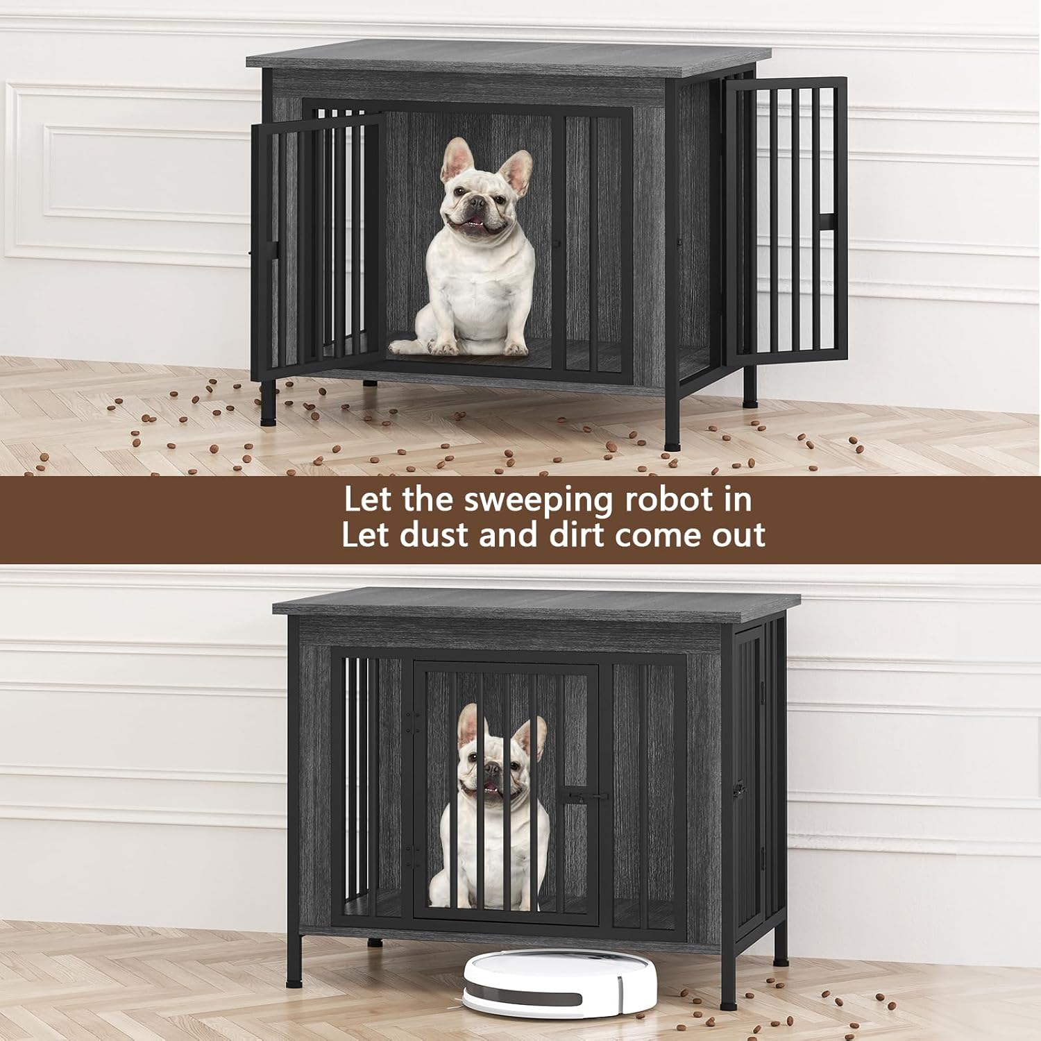 • 【Cleaning by Sweeping Robot】: With 3.94 inch raised feet, the dog crate furniture allows sweeping robots to enter and clean. Easily maintain cleanliness and tidiness, no need to struggle with moving dog cage during general cleaning. Keeping the bottom of the dog cage dry and clean can make dogs away from dust and moisture, preventing health hazards.