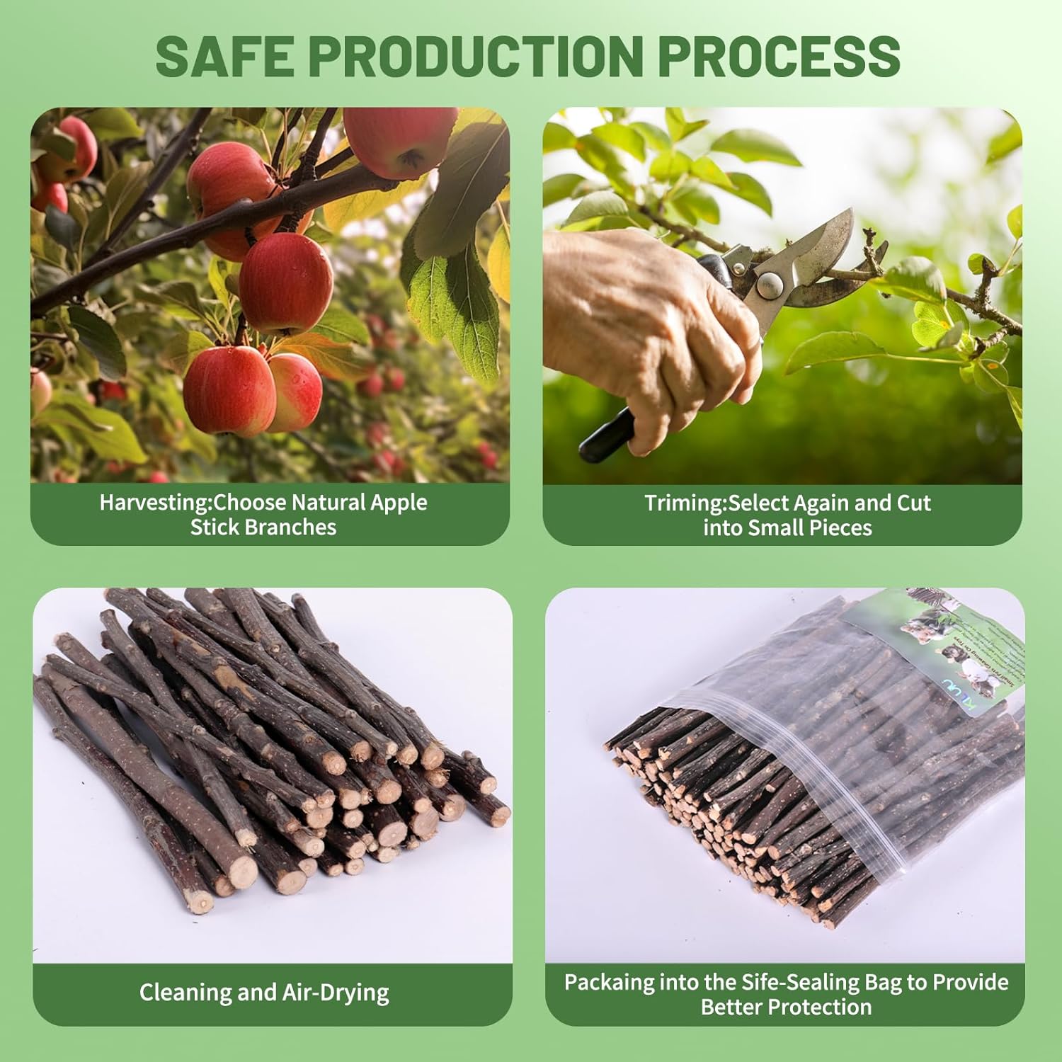- Natural and Safe: Apple sticks made from FSC-Certified wood, selected raw materials and refuse to add. On the premise of retaining the original fragrance of apple branches, it is dust-free, pollution-free, high dryness, and easy to store, which guarantee your pet babies safely chew.
