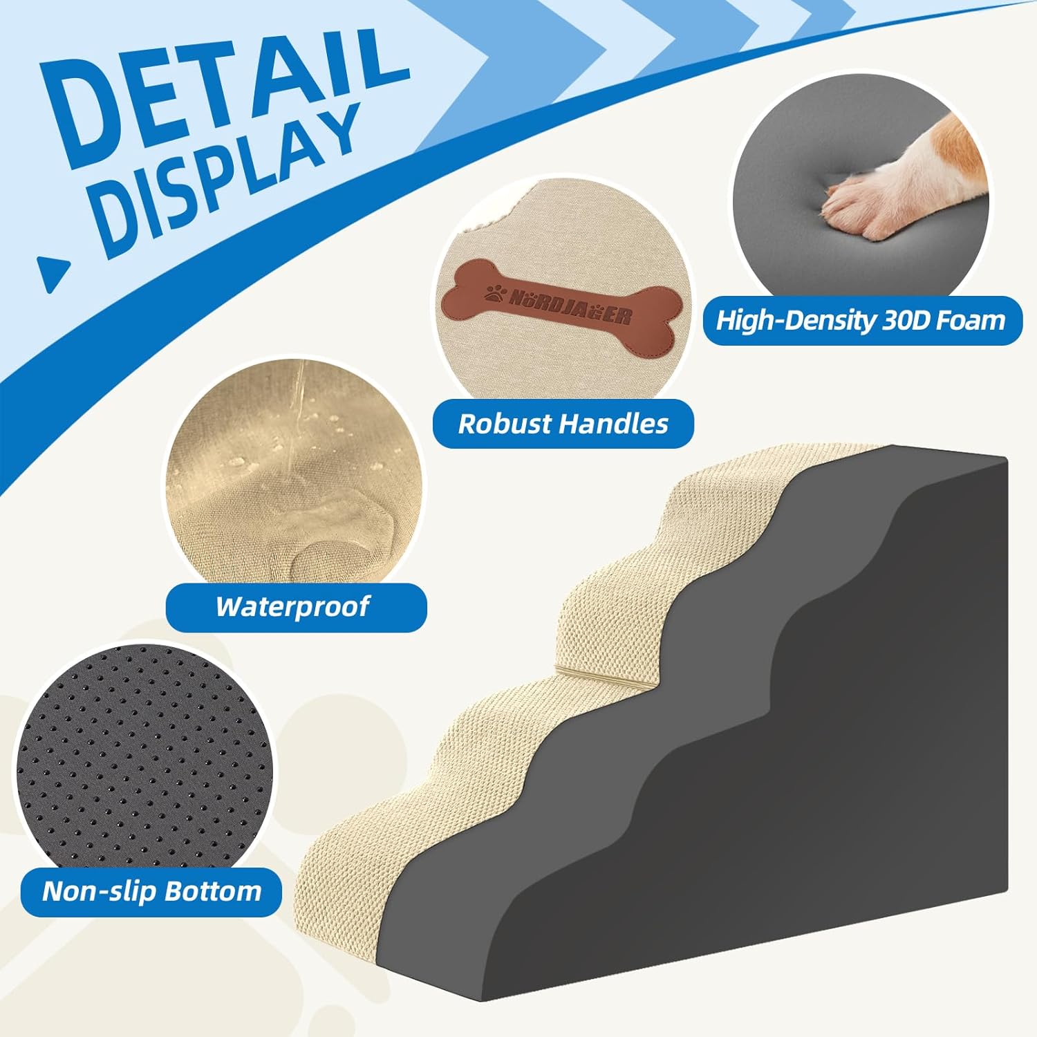 - Stable and Non-slip: The surface of the dog stairs is made of corduroy, and a waterproof layer is designed on the back, so you don't have to worry about the dog urinating; The side is made of wear-resistant linen, so that dogs can sharpen their claws; The bottom is made of anti-slip drop-plastic cloth, which can firmly attach to the ground to ensure the safety of dogs during climbing