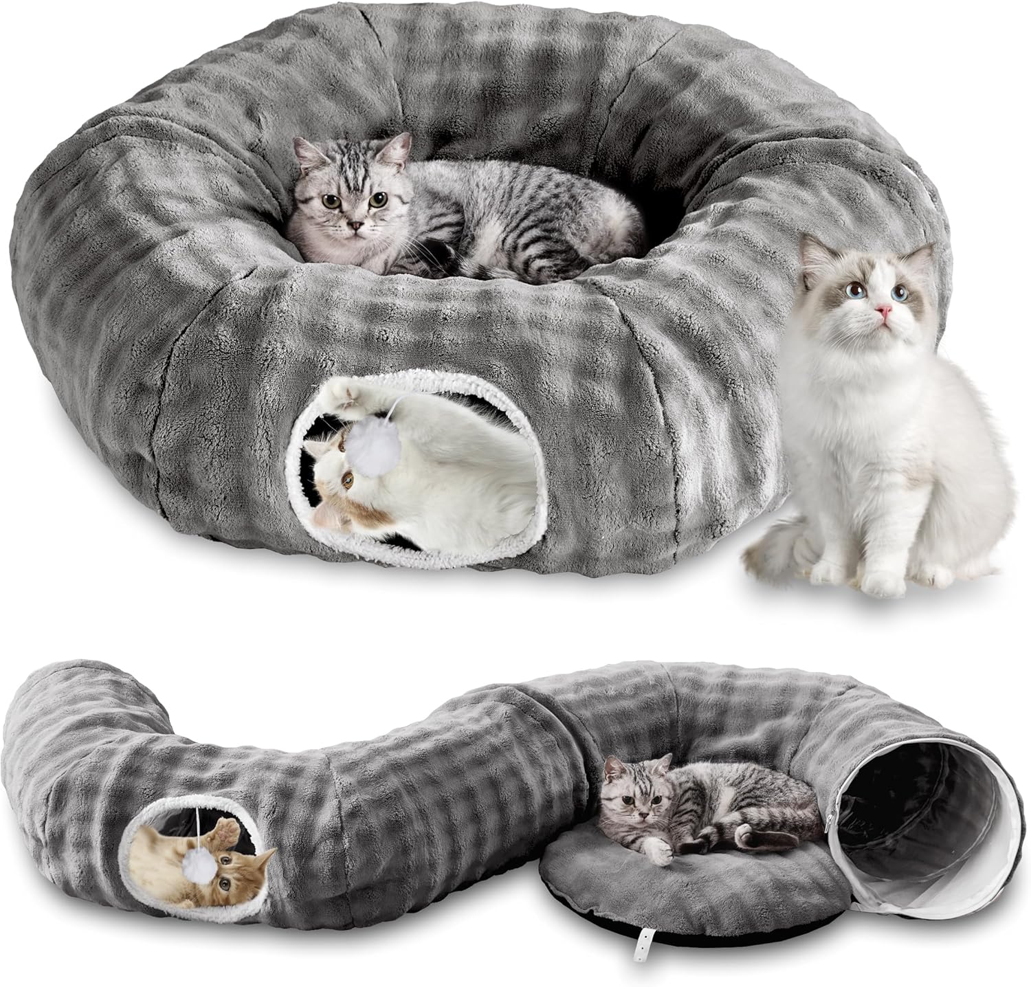 - Versatile Cat Tunnel: Unlike normal single S-shaped or T-shaped tunnels, this cat bed tunnel consists of two semi-circular tunnels and a round soft cushion. This design allows pets to freely switch between entertainment and rest. It can perfectly accommodate small pets up to 15 pounds such as cats, rabbits, or ferret. Pets can immediately have a cozy and peaceful place to rest after exciting games. Perfect for families with multiple furry pet friends. Not just a toy, but also a bed