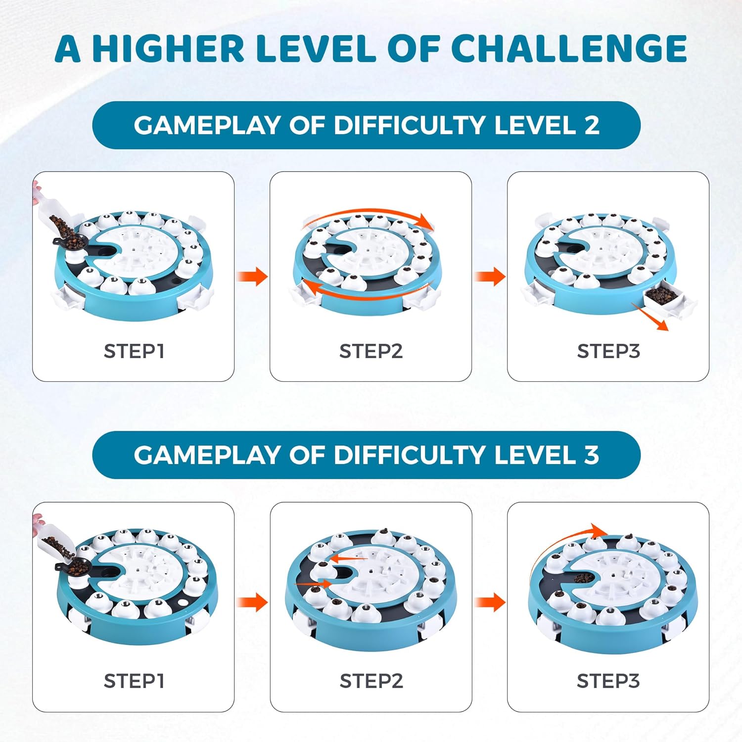 - Adjustable Challenges Levels - This puzzle toy can support multiple levels, from very easy to difficult, so you don’t have to buy multiple puzzle toys. This puzzle can alongside your dog's understanding, gradually increasing the challenge.