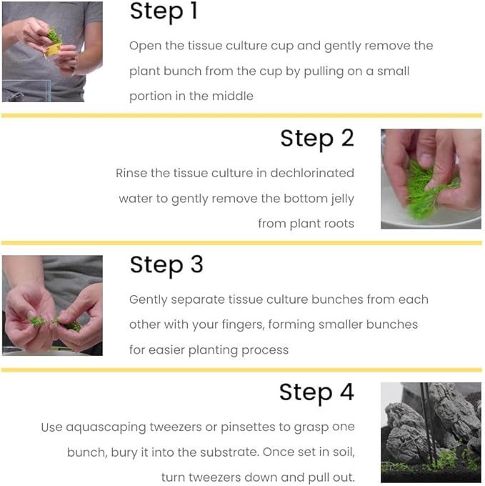 - Divide stems from gel and plant upright in substrate using aquascaping tweezers.