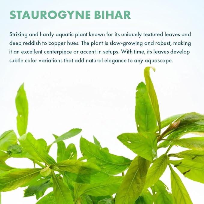 - Staurogyne Bihar features rich olive green stems and dense foliage, ideal for creating structured contrast and textured layering in the foreground or midground of aquascaped tanks.